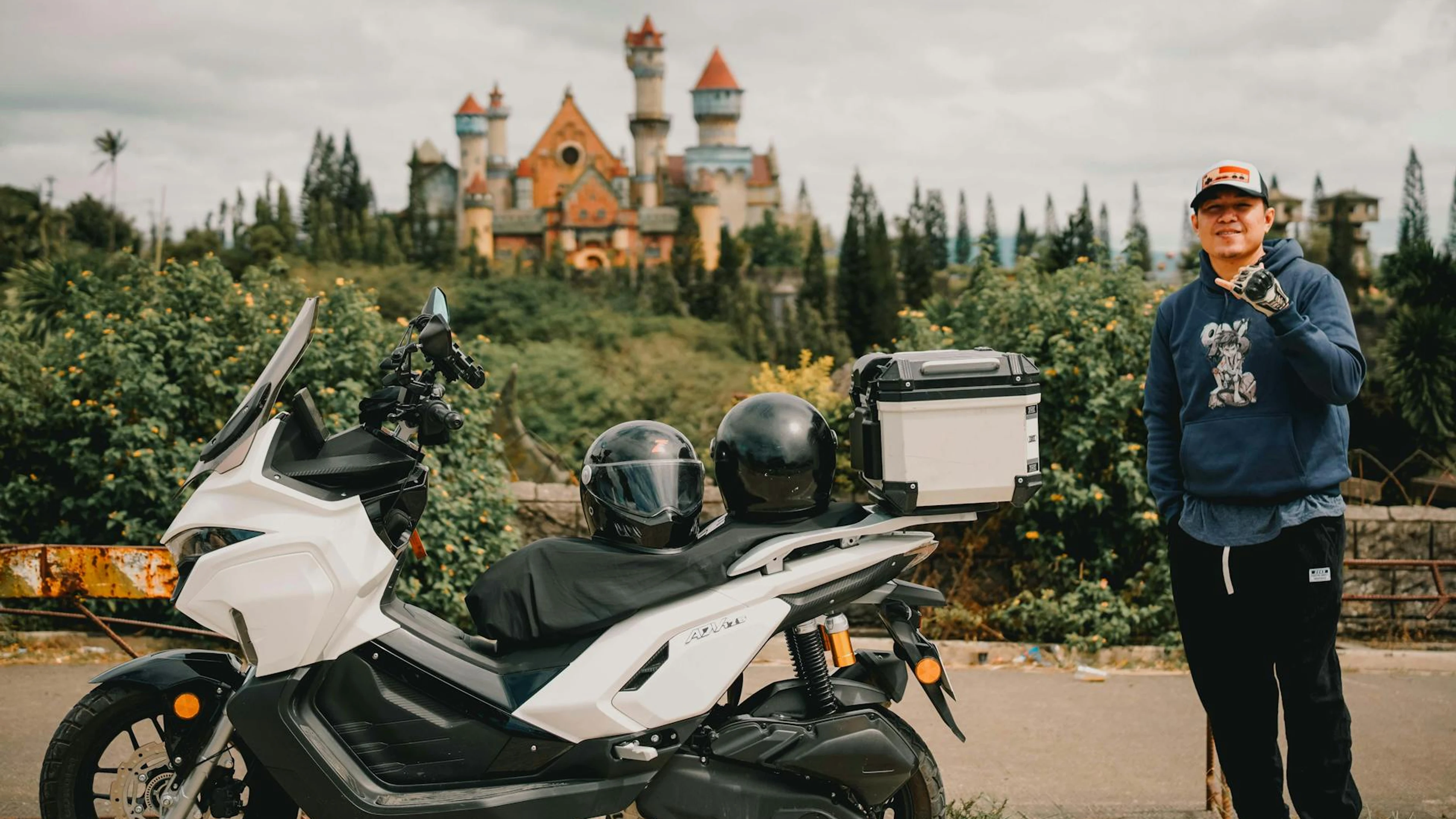 Man standing beside motorcycle near a fantasy castle on a cloudy day.