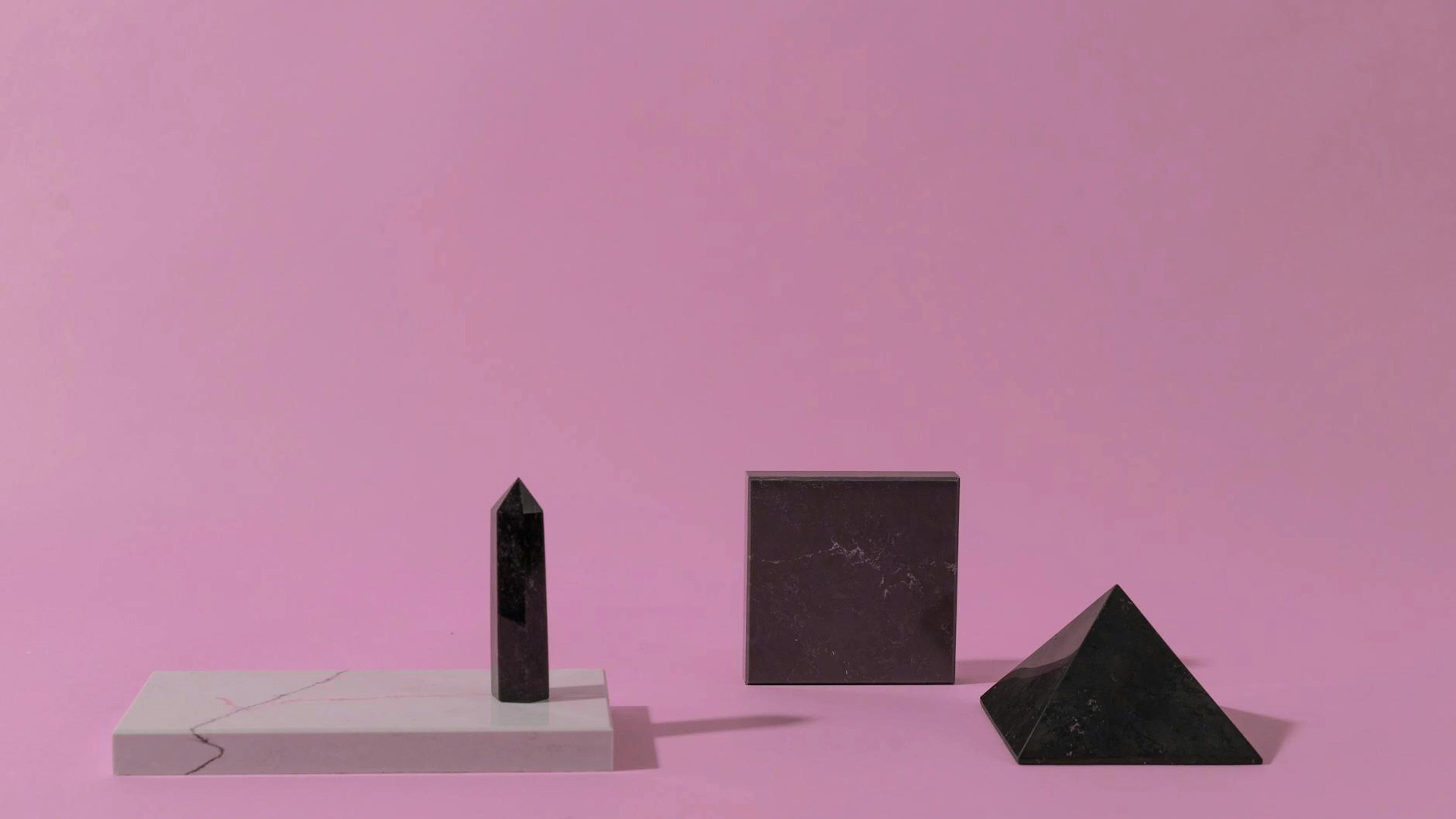 Minimalist composition of geometric marble shapes on a pink background.