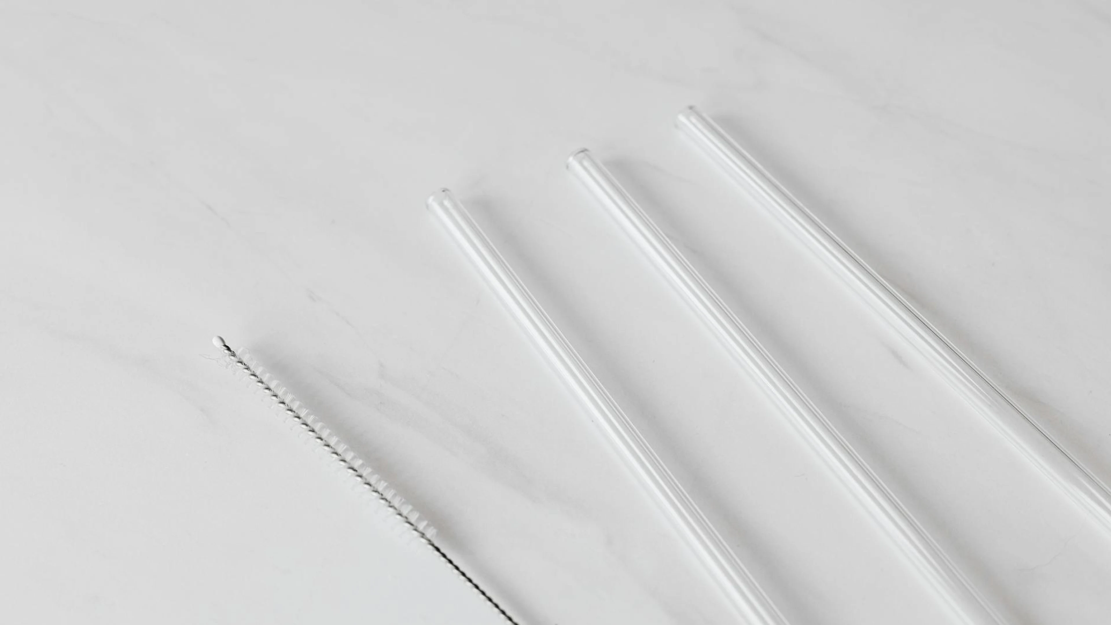 Minimalist image of three transparent glass straws and a cleaning brush on a whi