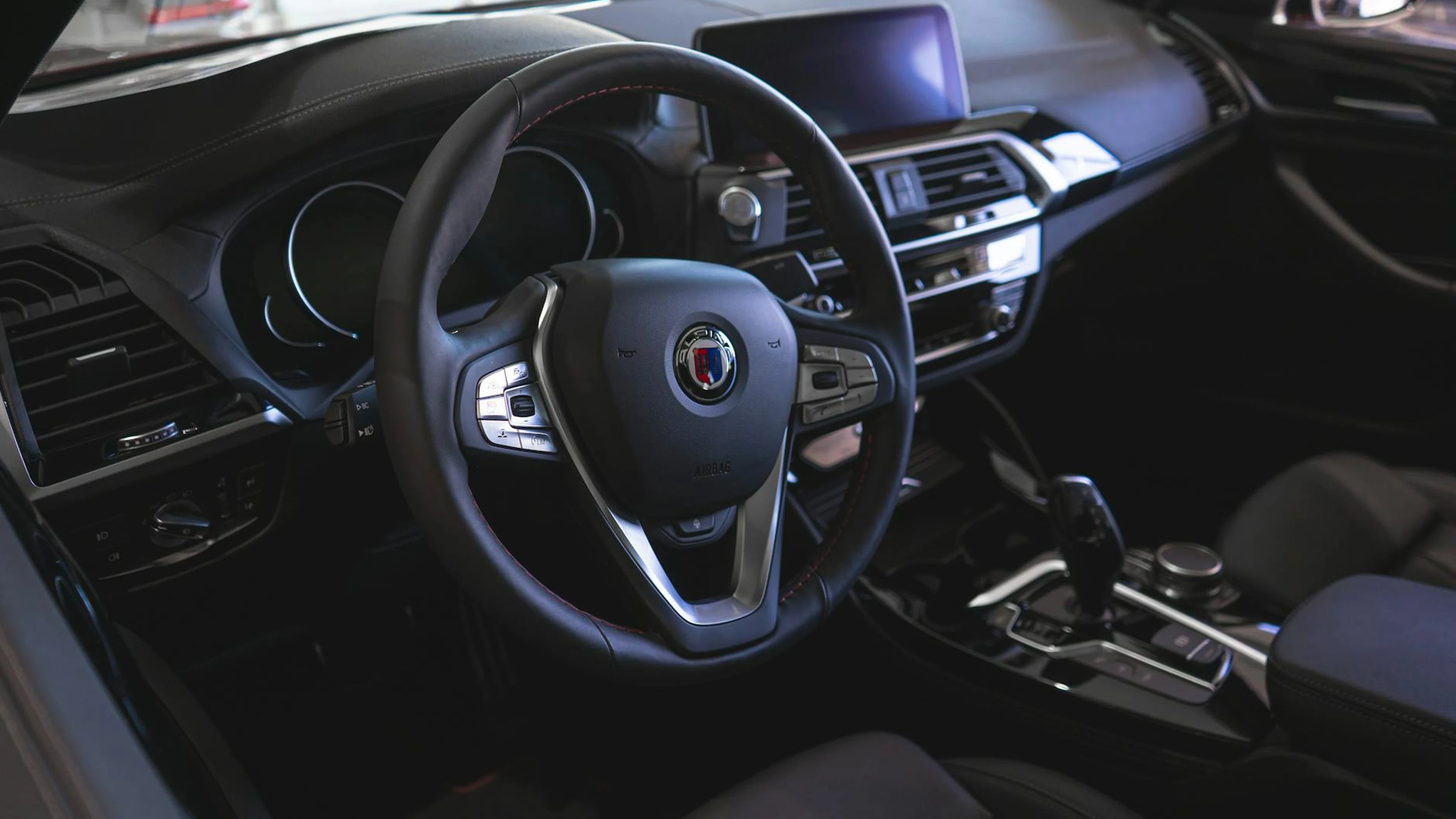Modern car interior showcasing a sleek steering wheel and high-tech dashboard fe