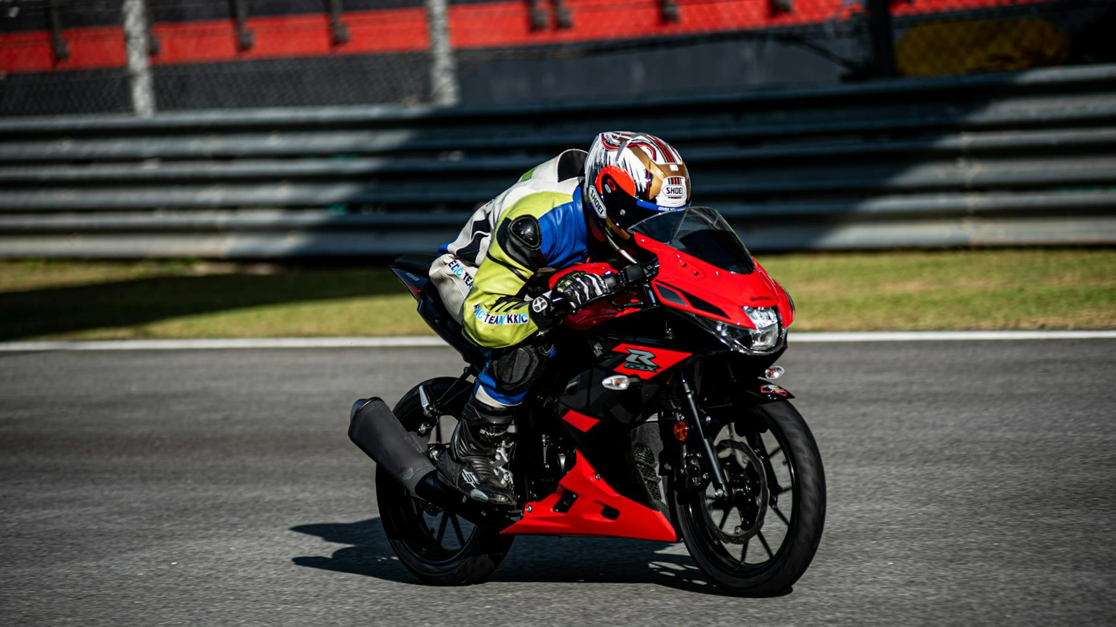 Motorcycle racer in full gear speeding on an asphalt track during the day.