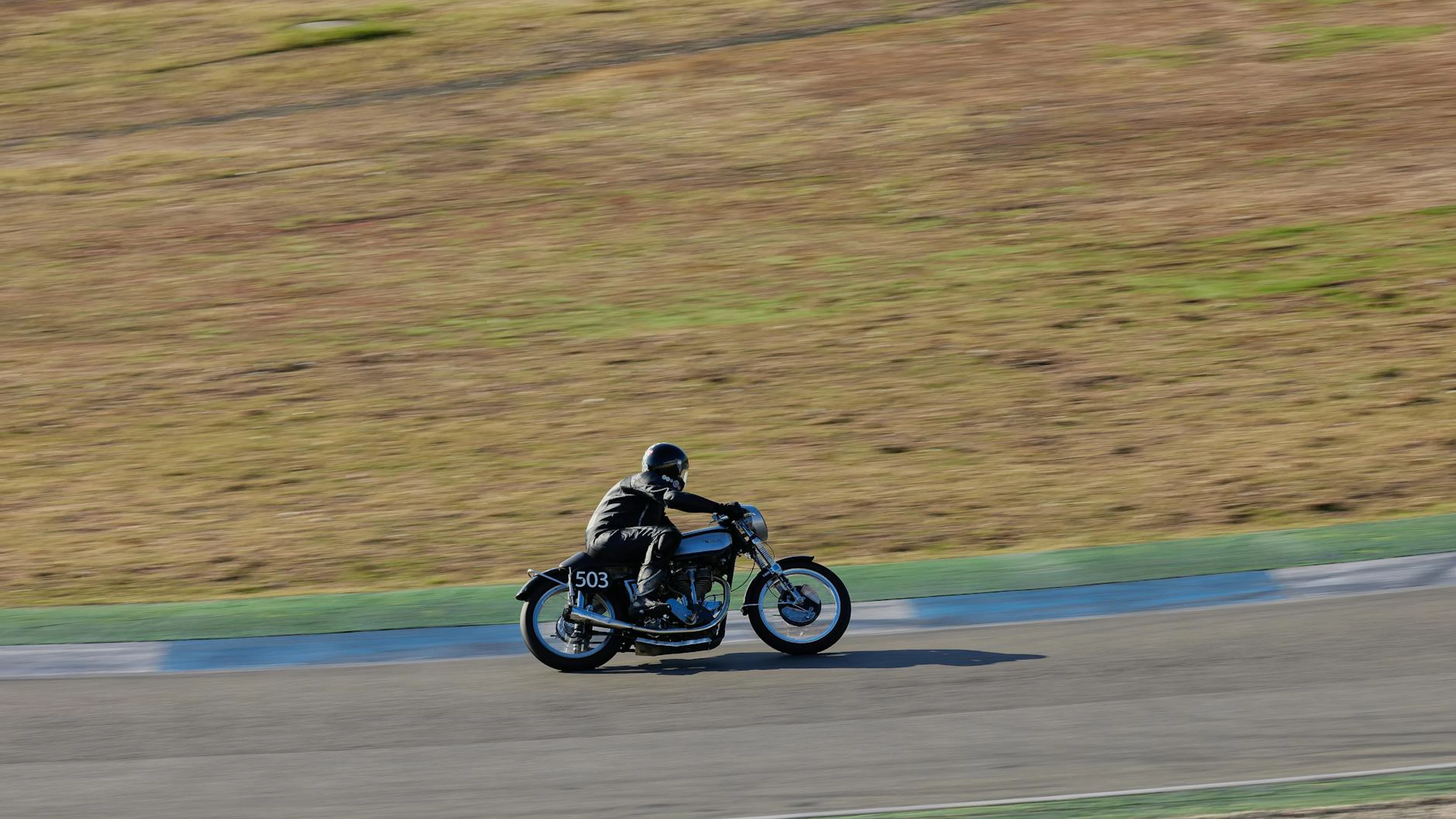 Get this stunning Motorcyclist on vintage bike racing on track during the day. wallpaper in 4K Ultra HD quality. 3840x2160 motorcycle wallpaper available for free download.