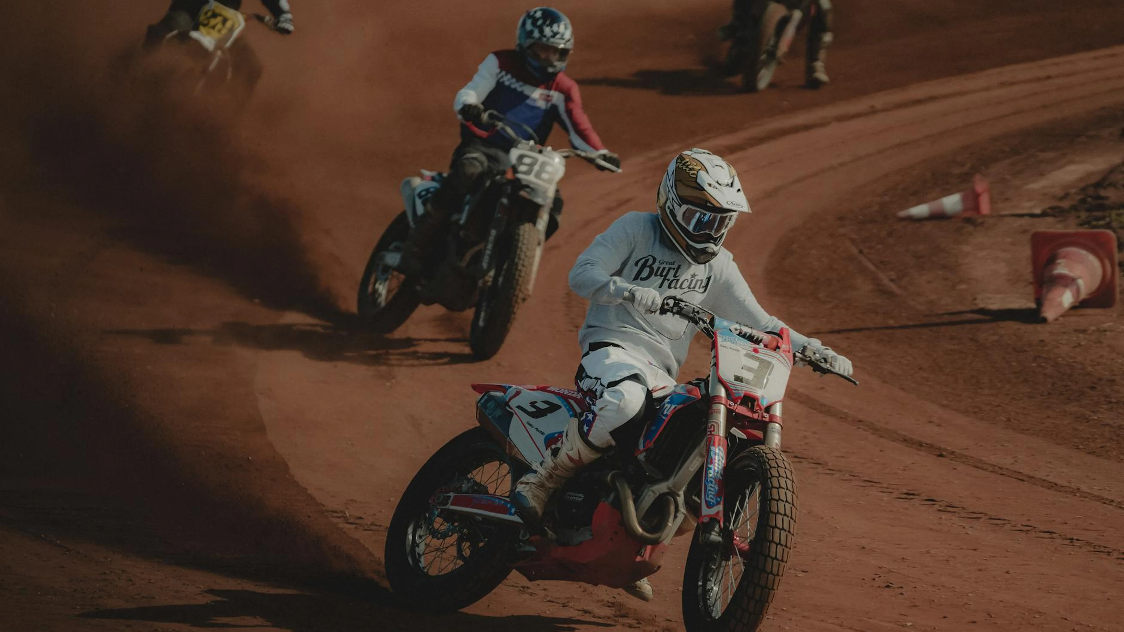 Download Motorcyclists racing on a dirt track, showcasing speed and agility in an offroad wallpaper for free. 3840x2160 4K Ultra HD resolution, perfect for your desktop. High quality motorcycle wallpaper.
