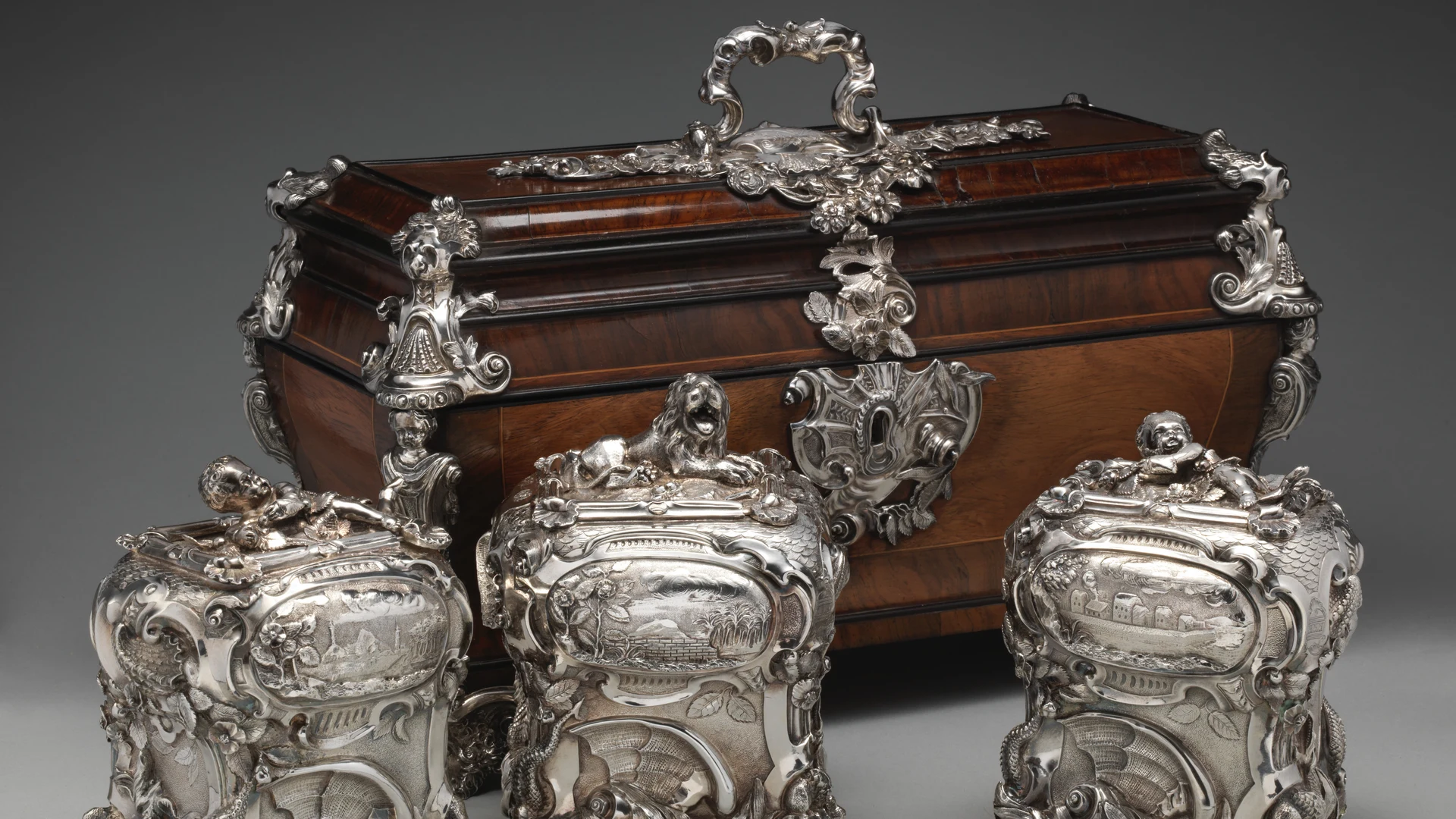 Free Pair of tea caddies and a sugar box in a case wallpaper in tablet resolution (1920x1080). Beautiful flowers background for your screen. No signup required.