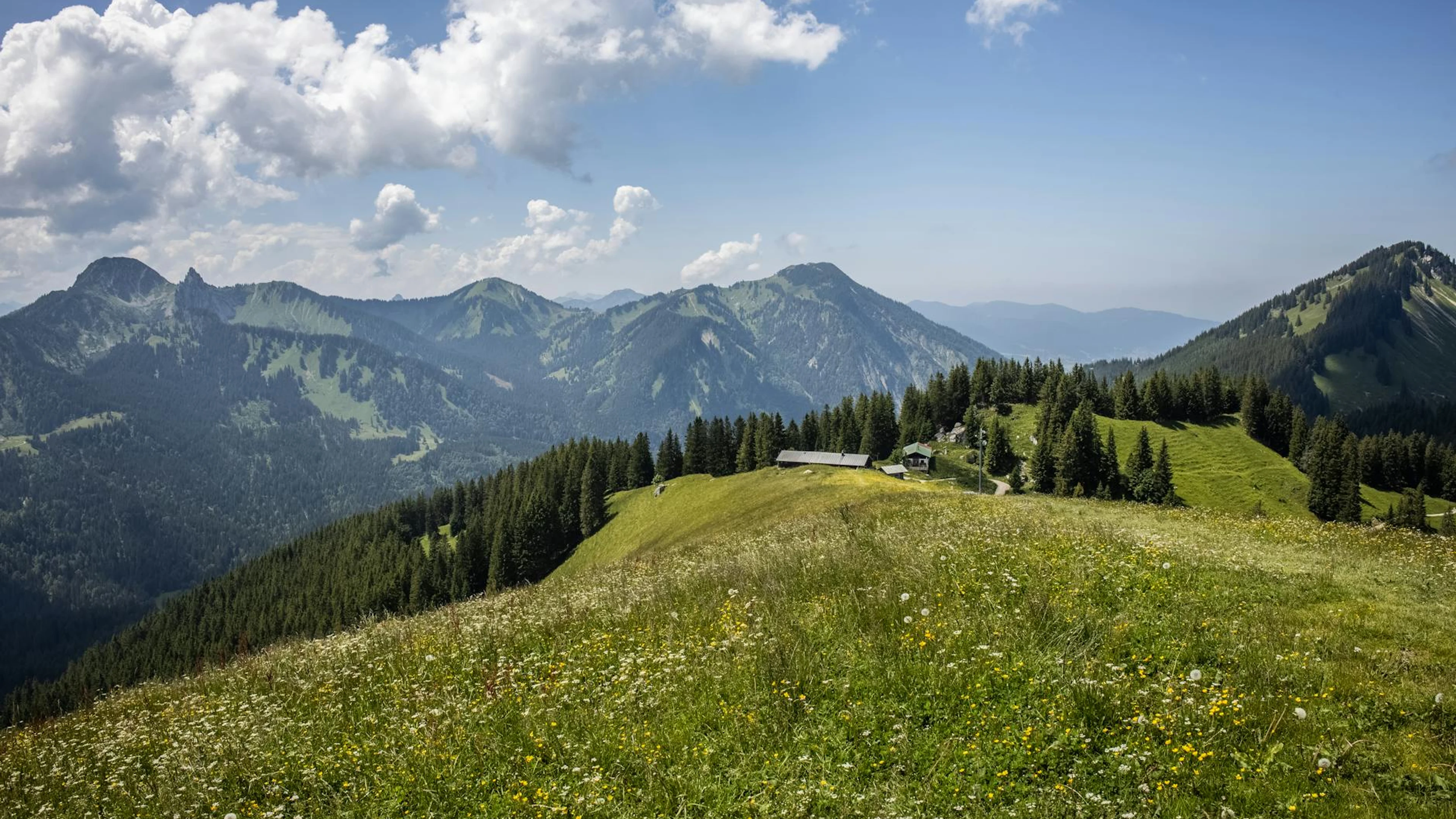 Get this stunning Panoramic view of alpine mountains and lush green meadows under a bright blue sk wallpaper in 4K Ultra HD quality. 3840x2160 nature wallpaper available for free download.