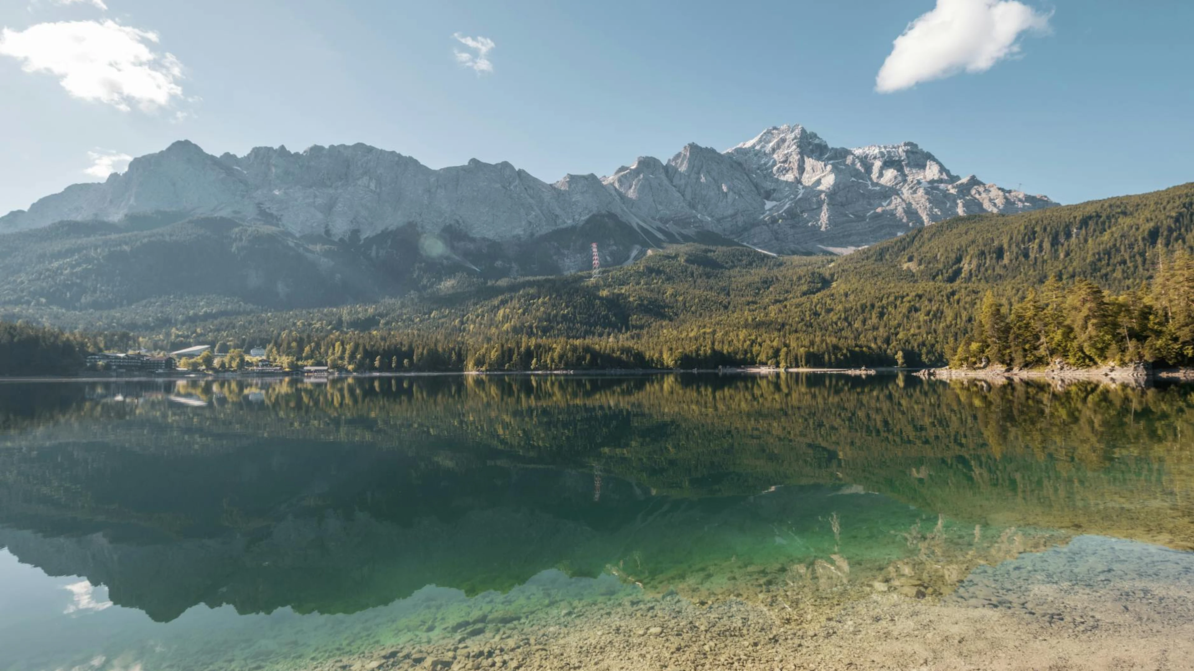 Free Panoramic view of Zugspitze reflecting in Eibsee Lake, showcasing clear skies an wallpaper in 4K Ultra HD resolution (3840x2160). Beautiful nature background for your screen. No signup required.