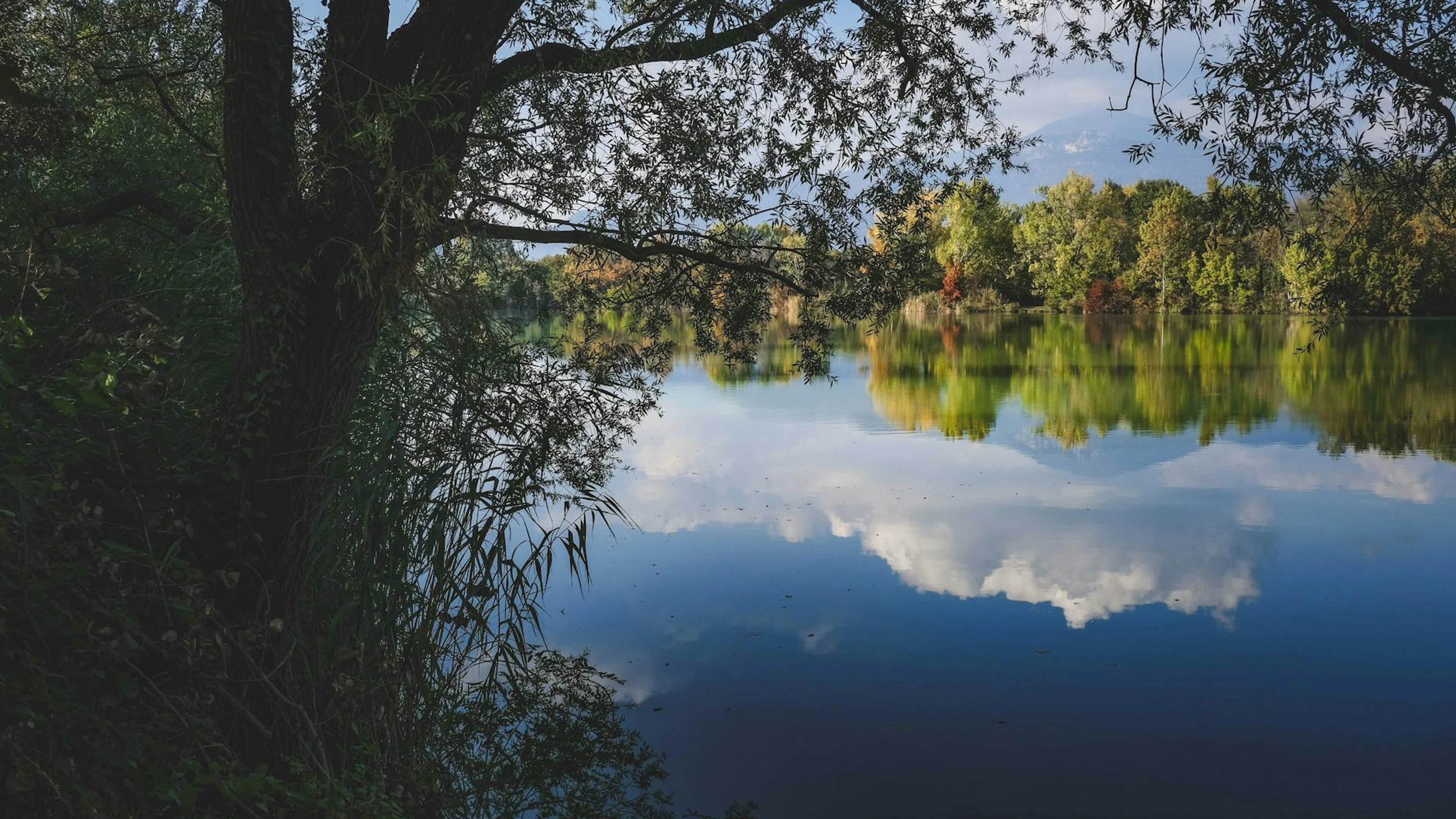 Get this stunning Peaceful lakeside scene with trees reflecting on calm water under a clear blue s wallpaper in 4K Ultra HD quality. 3840x2160 lake wallpaper available for free download.