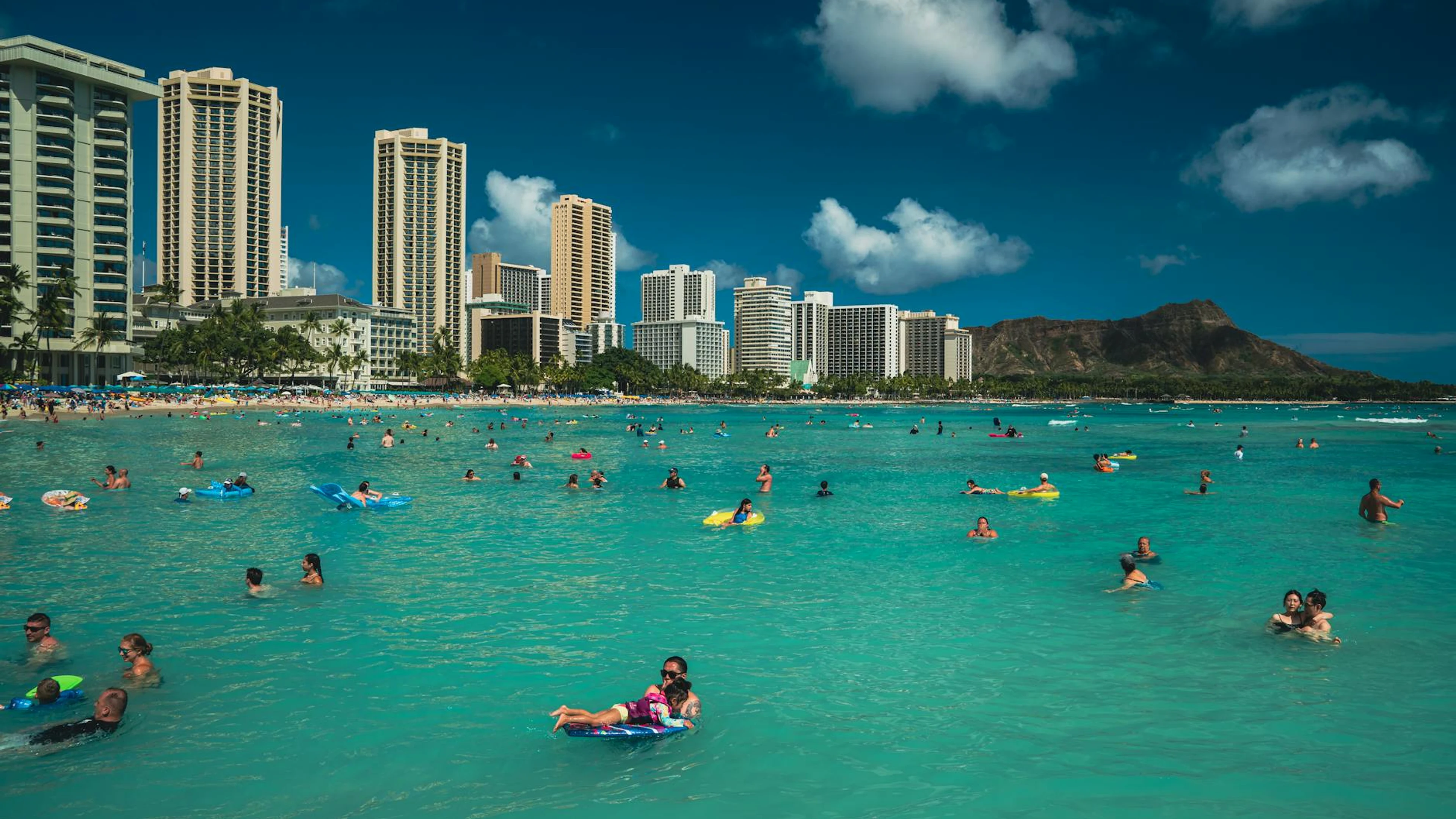 Free People enjoying a sunny day at Waikiki Beach with Diamond Head in the background wallpaper in 4K Ultra HD resolution (3840x2160). Beautiful ocean background for your screen. No signup required.