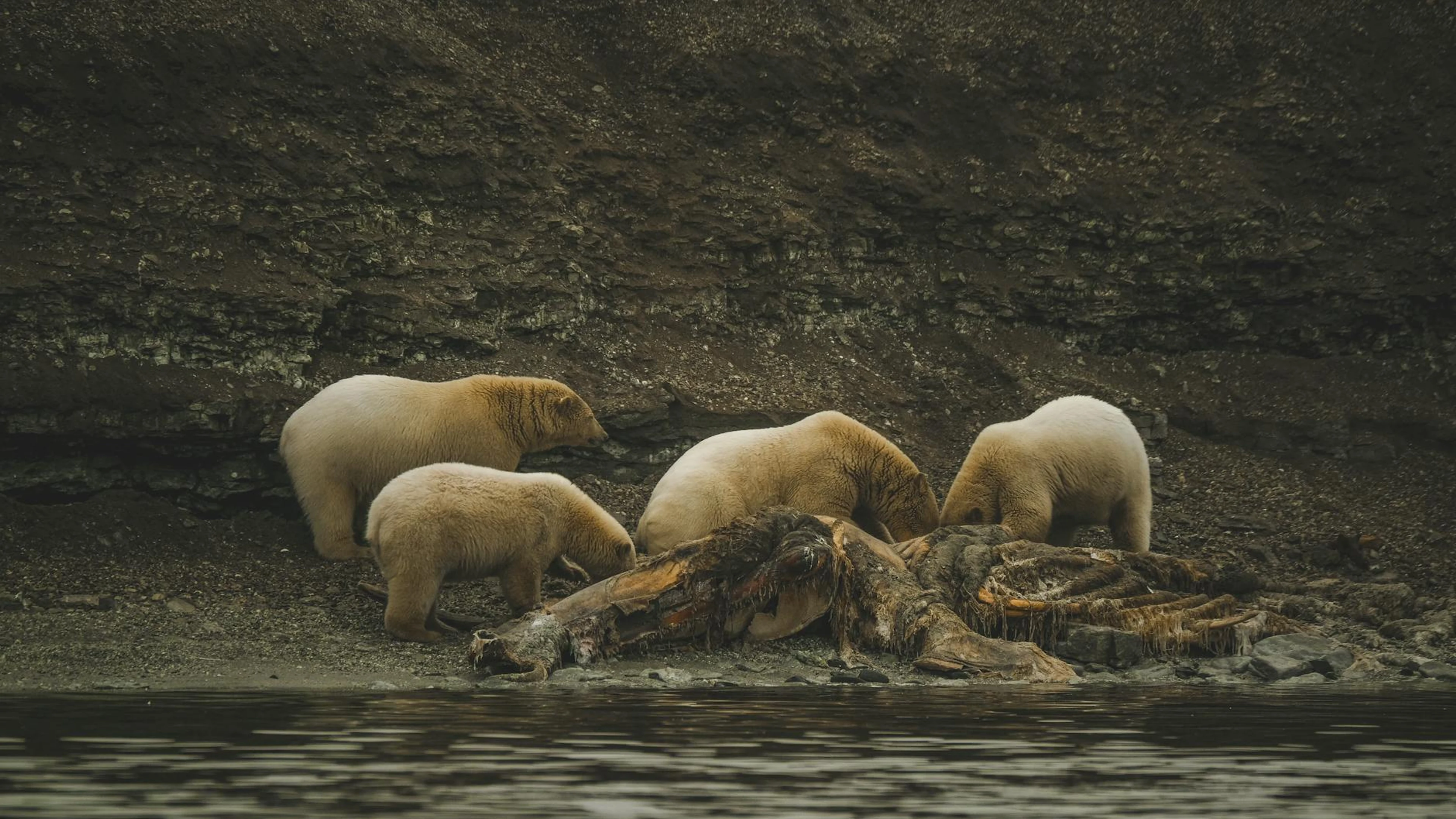 Polar bears feasting on a carcass in their natural habitat by the seashore.