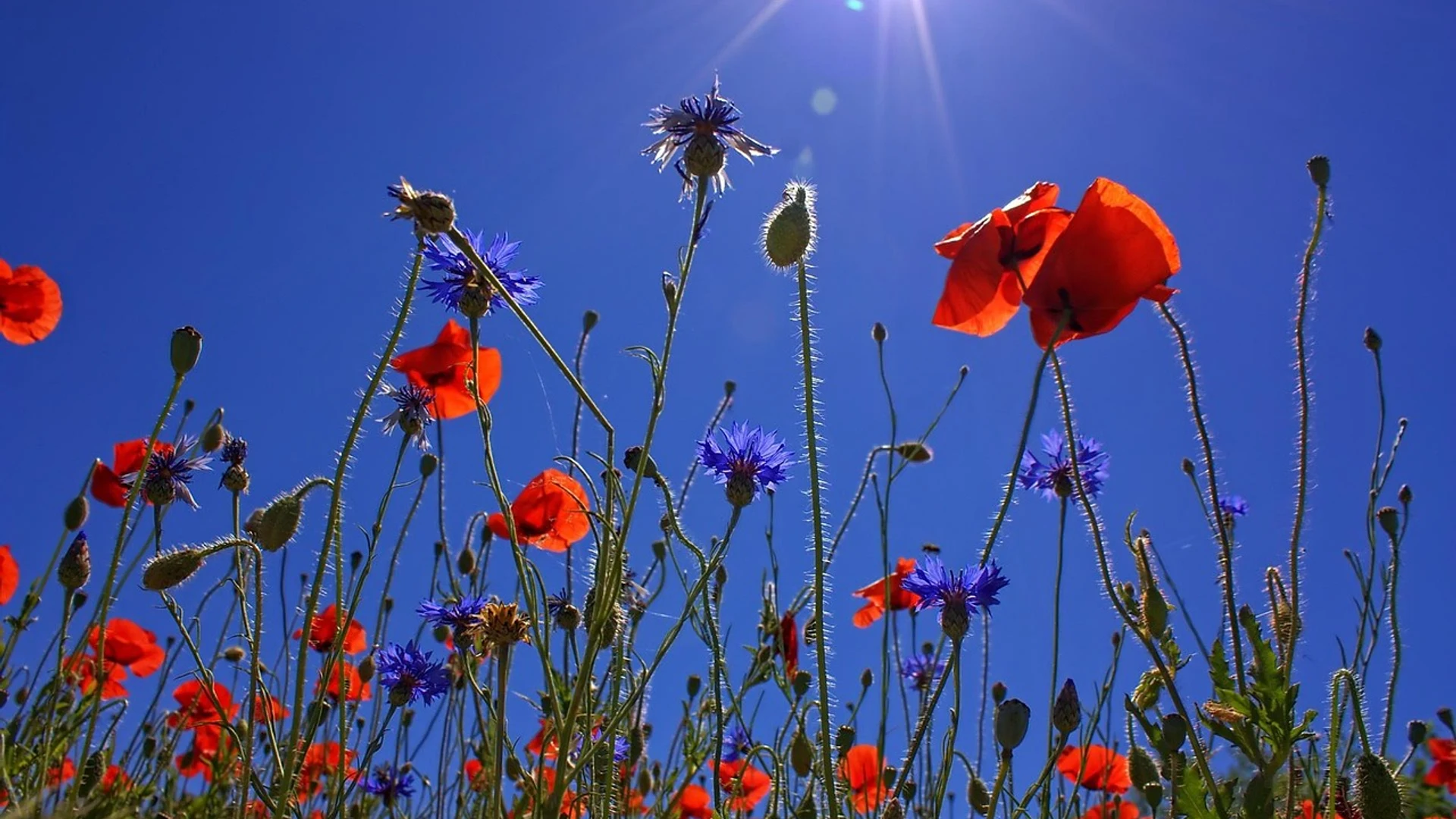 Free Poppies blue sky flowers wallpaper in tablet resolution (1920x1080). Beautiful flowers background for your screen. No signup required.