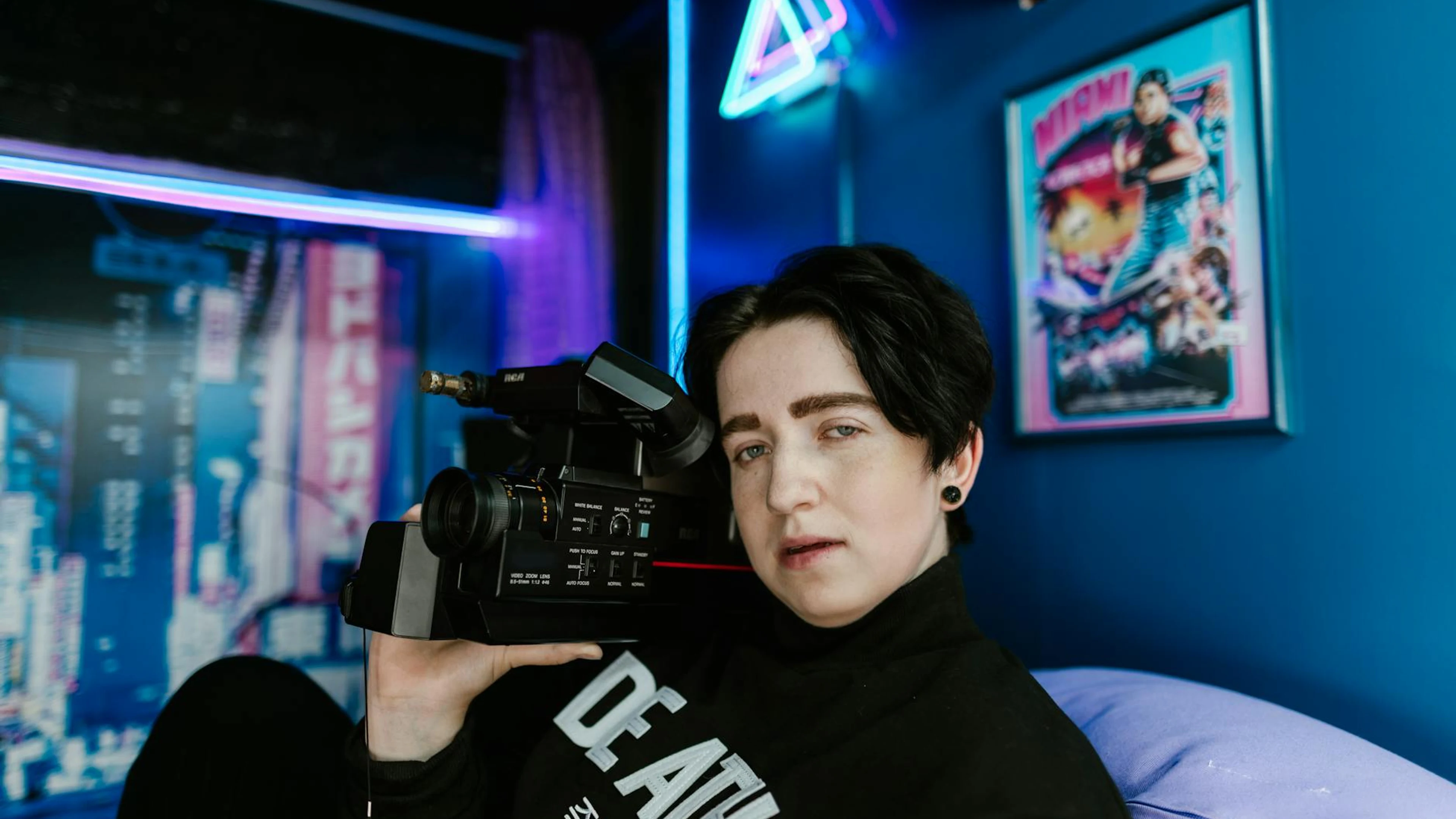 Portrait of a person holding a vintage camcorder in a neon-lit room, capturing a