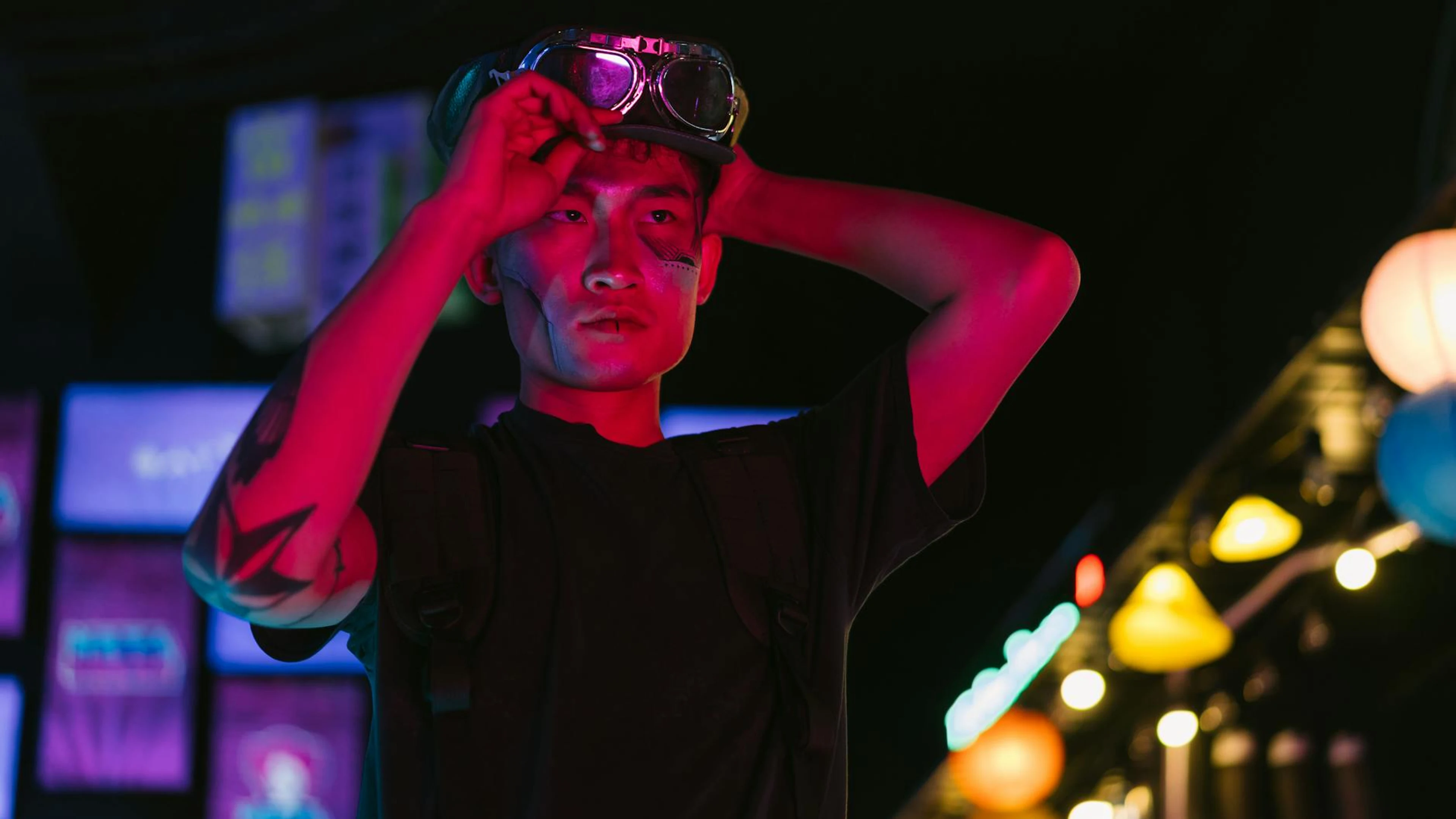 Portrait of an Asian man wearing futuristic goggles in a vibrant, neon-lit cyber