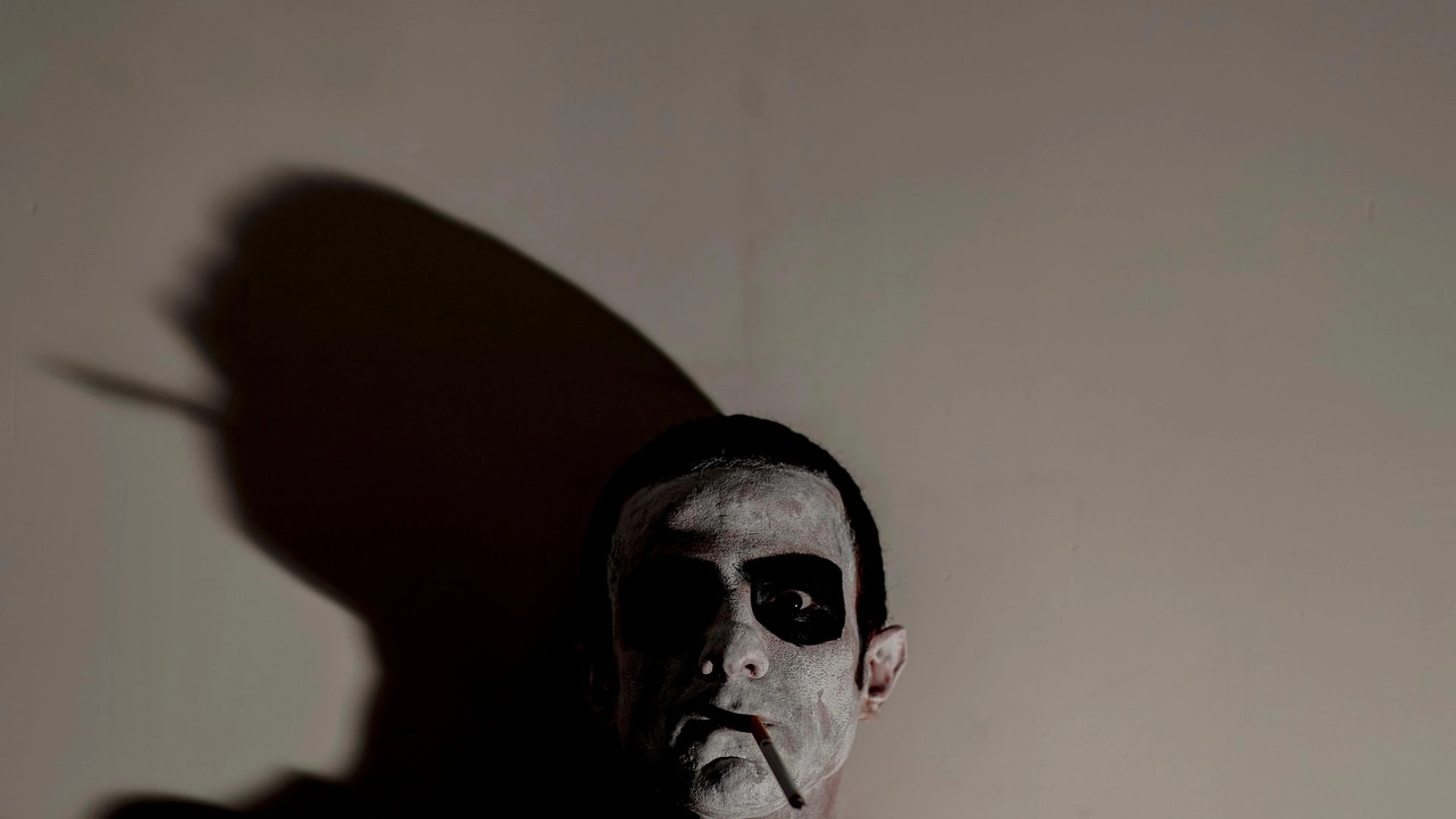 A woman in gothic attire poses against a patterned wall with bold makeup and lac