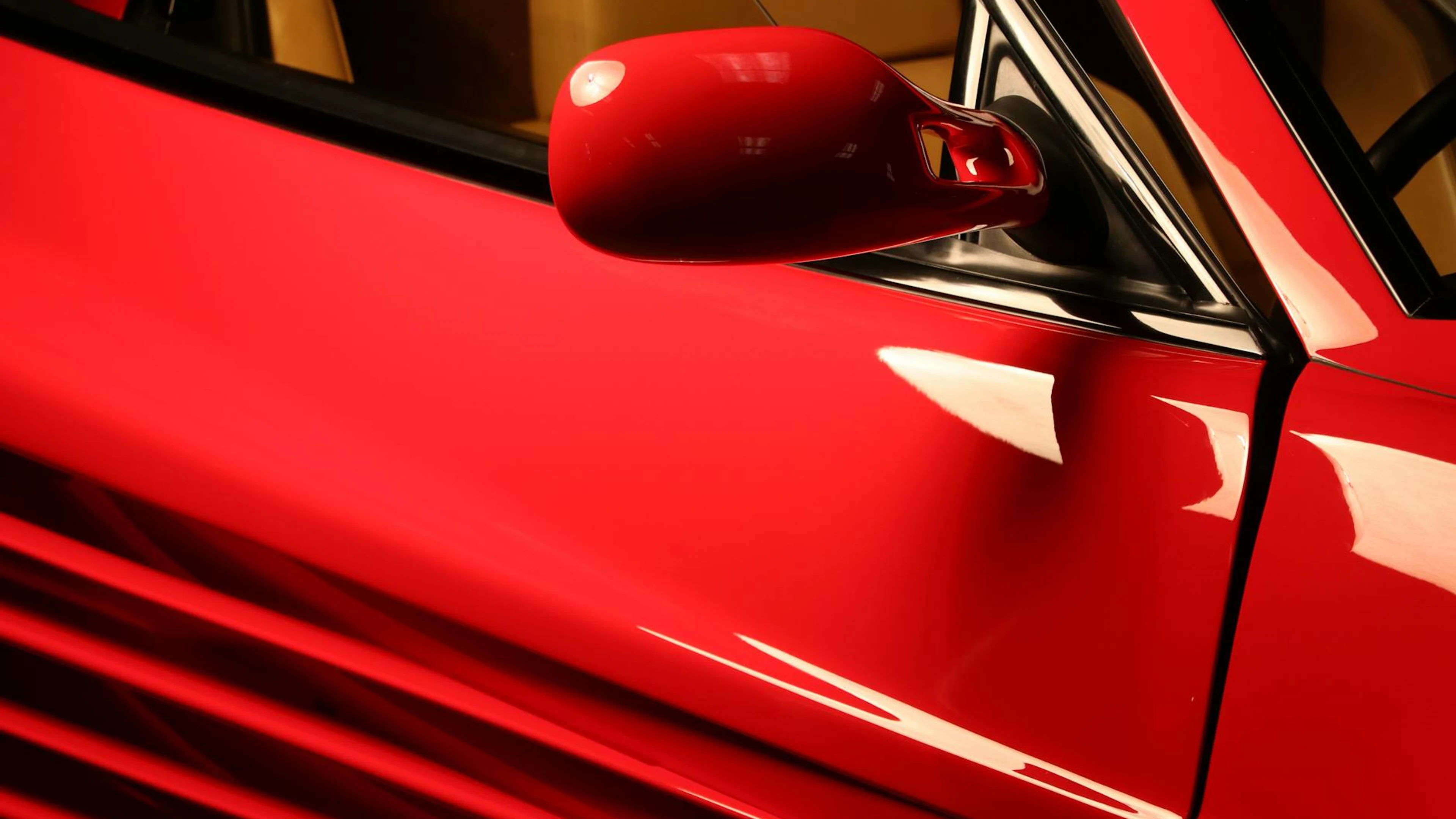 Red Ferrari Testarossa side mirror detail shot showcasing luxury design elements