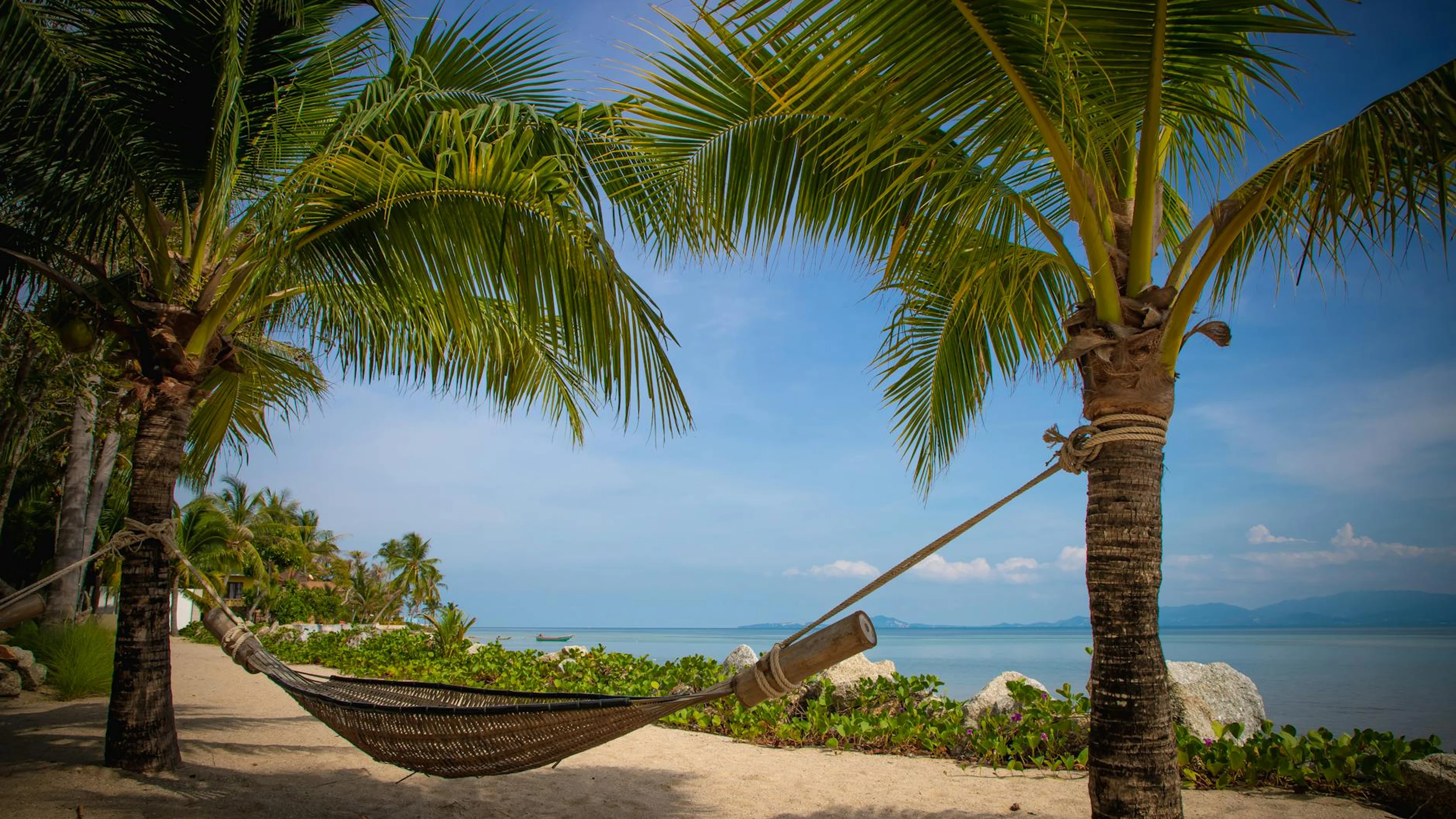 Download Relaxing hammock between palm trees on a sunny tropical beach. wallpaper for free. 3840x2160 4K Ultra HD resolution, perfect for your desktop. High quality ocean wallpaper.