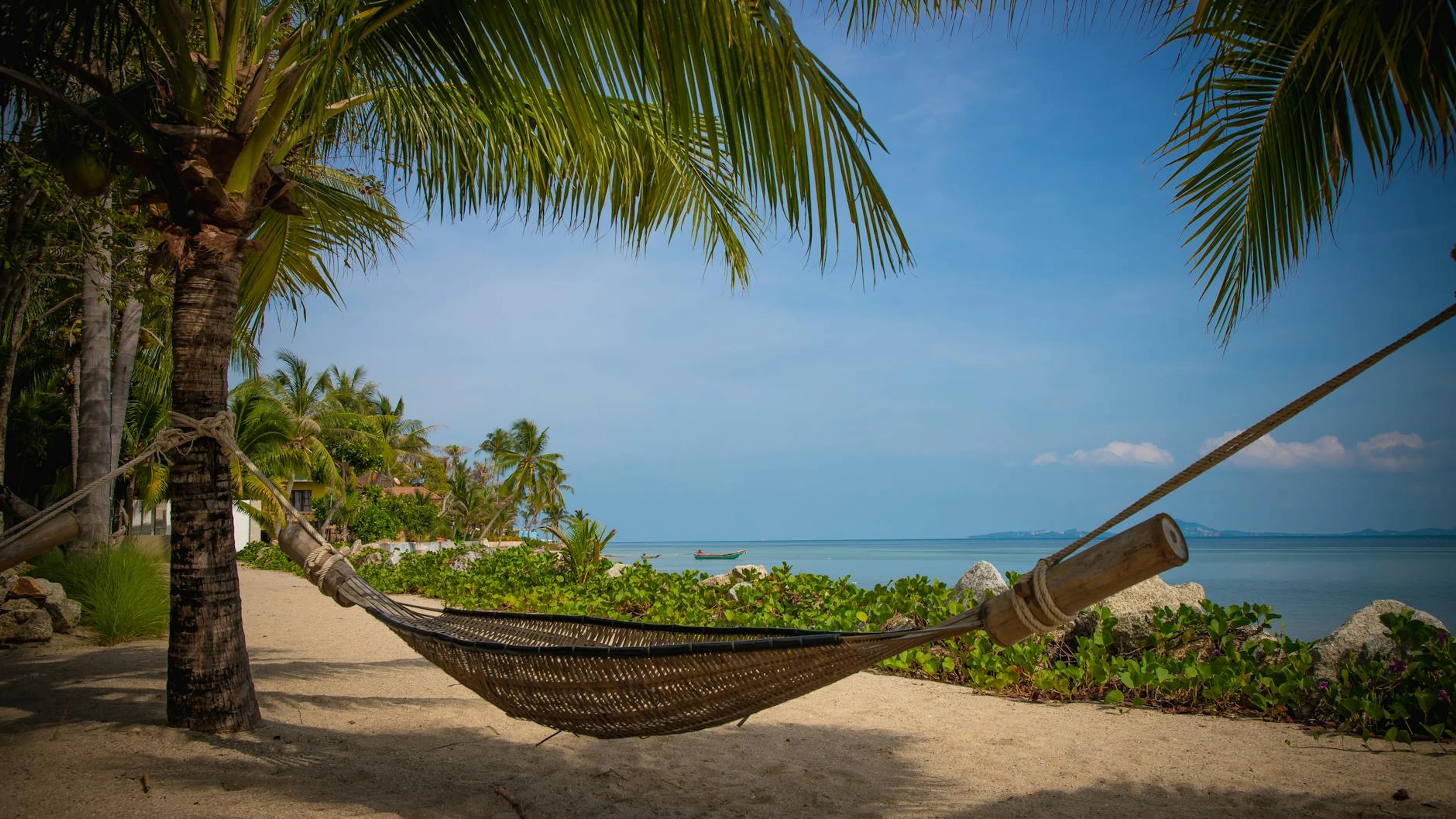 Get this stunning Relaxing hammock under palm trees on a tropical beach, perfect for a serene geta wallpaper in 4K Ultra HD quality. 3840x2160 ocean wallpaper available for free download.