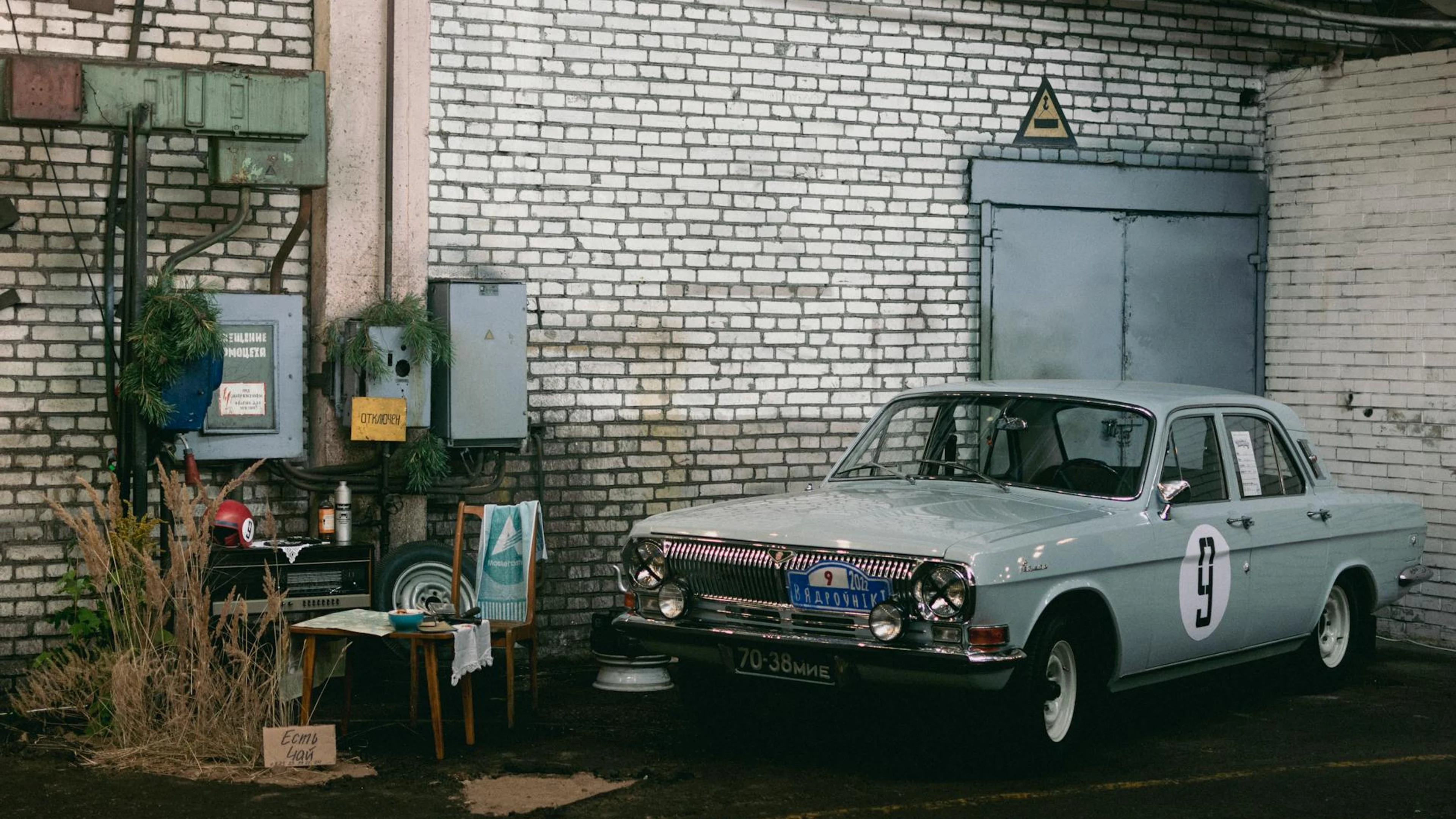 Retro Gaz car parked in urban Minsk garage setting with industrial vibes.