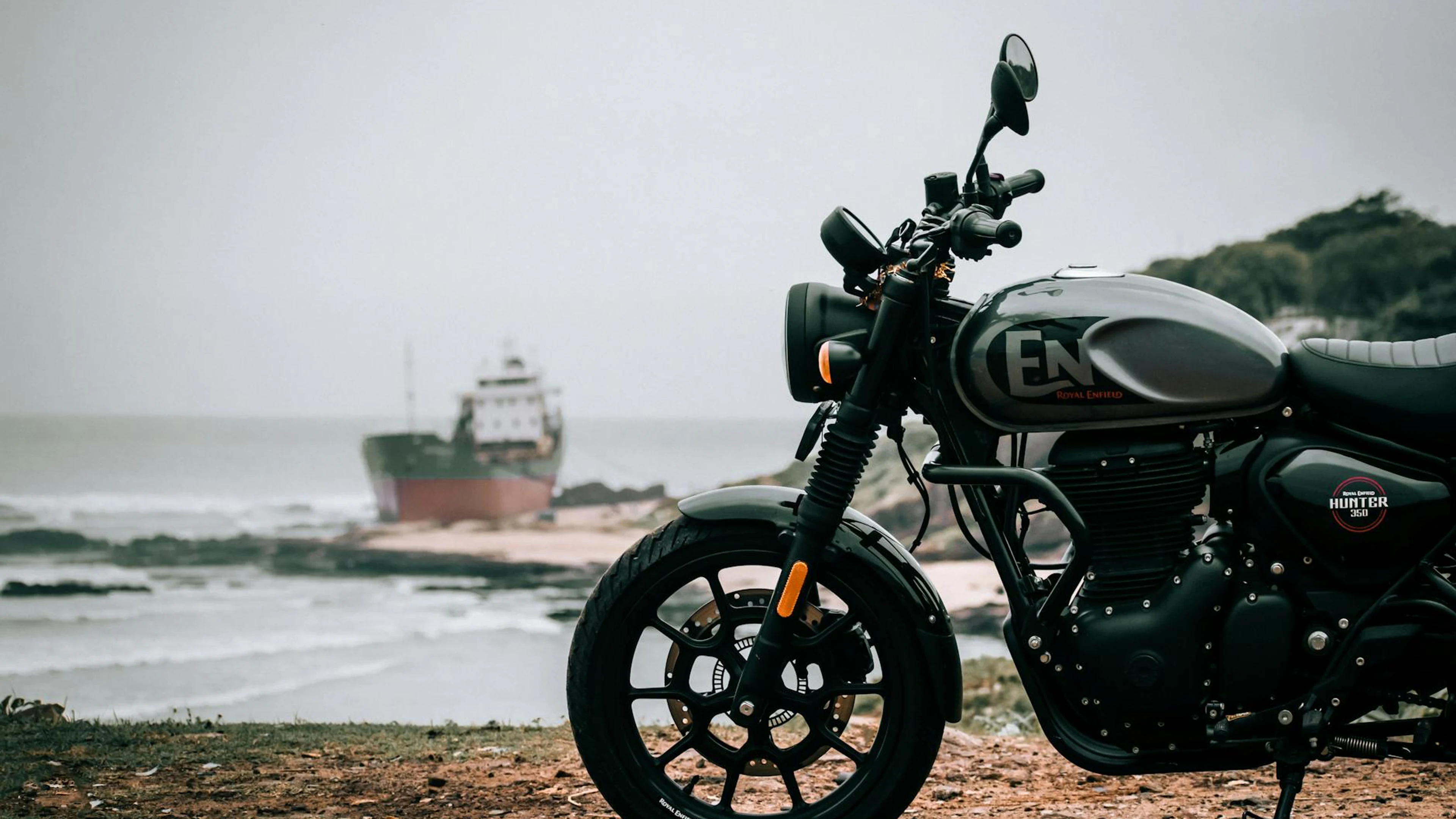Get this stunning Royal Enfield Hunter 350 motorcycle parked with a ship in the background near th wallpaper in 4K Ultra HD quality. 3840x2160 motorcycle wallpaper available for free download.