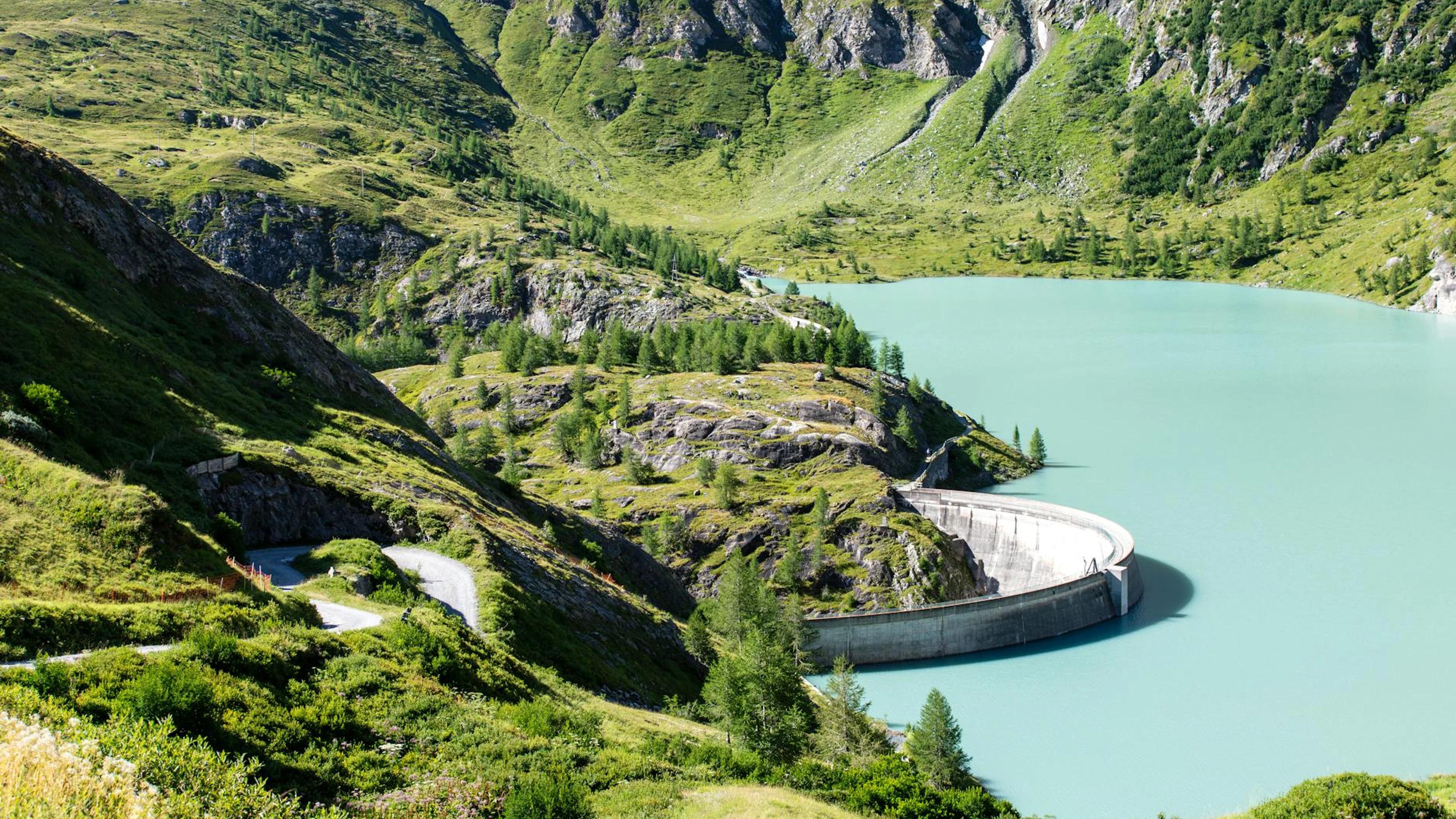 Download Scenic view of an alpine reservoir surrounded by lush green mountains in Korutan wallpaper for free. 3840x2160 4K Ultra HD resolution, perfect for your desktop. High quality mountain wallpaper.