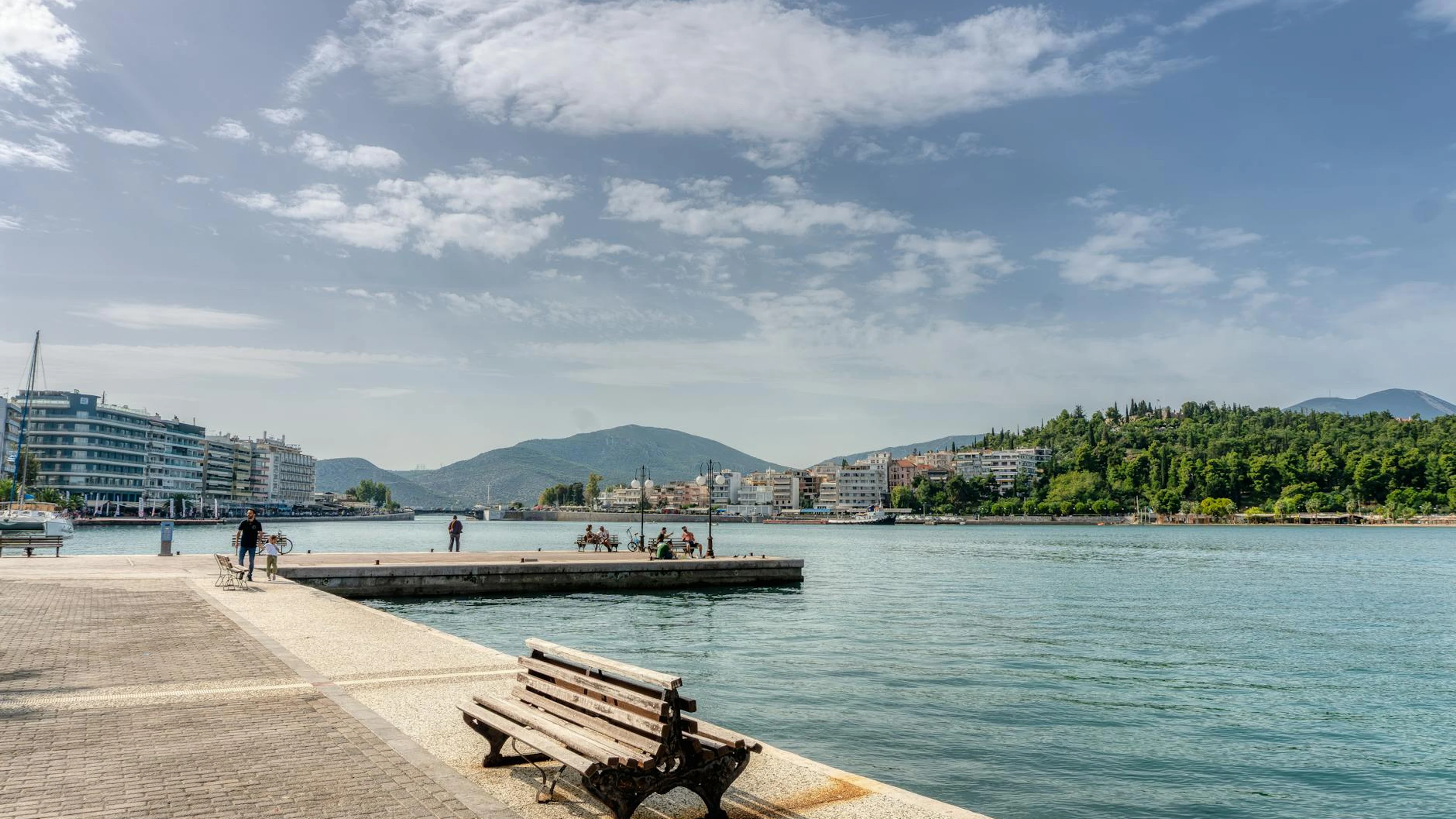 Download Scenic view of Chalkida's promenade with a bench and view of the sea. wallpaper for free. 3840x2160 4K Ultra HD resolution, perfect for your desktop. High quality nature wallpaper.