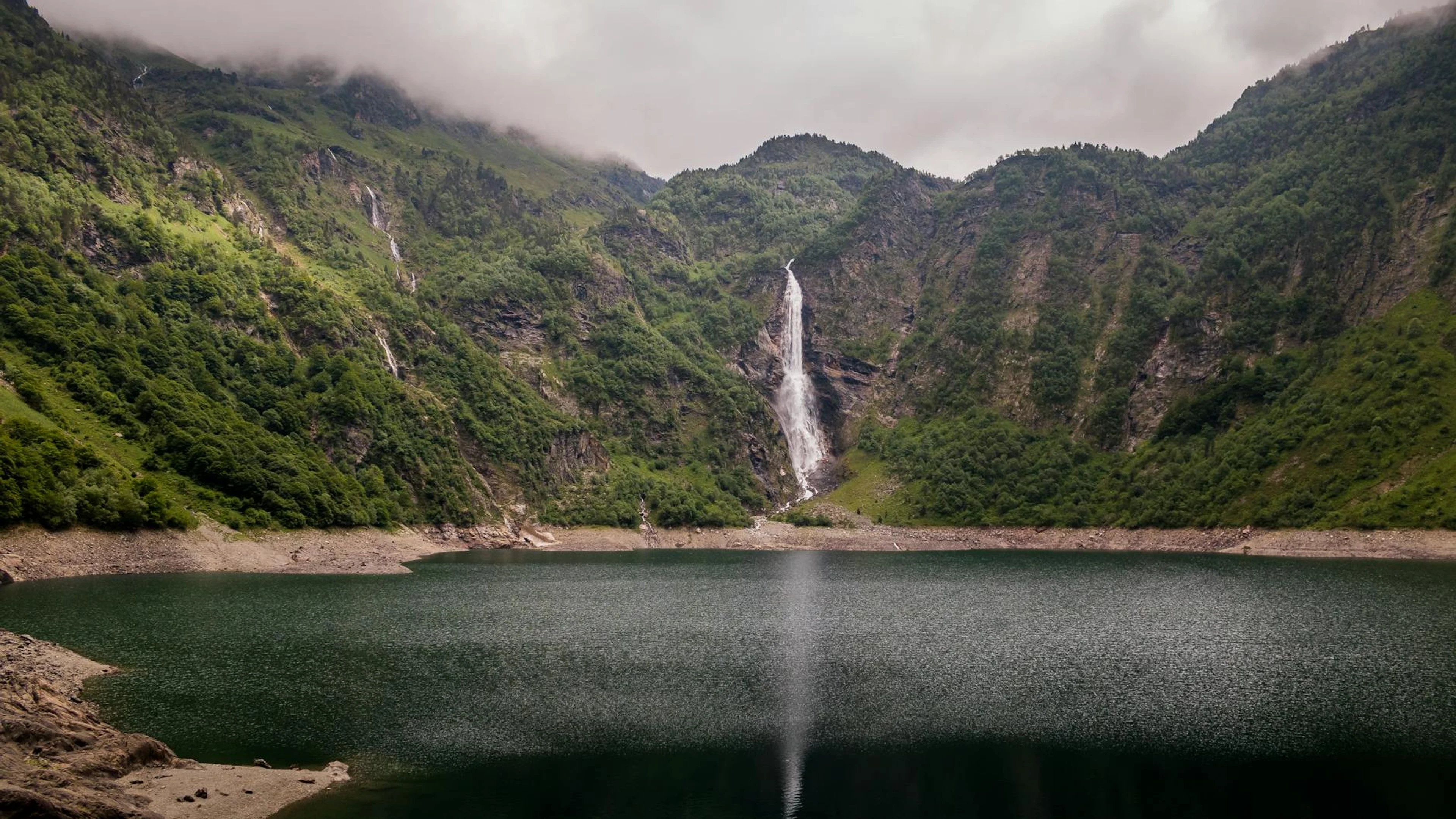 Serene landscape of a waterfall cascading into a lake in Oô, Occitanie, France.