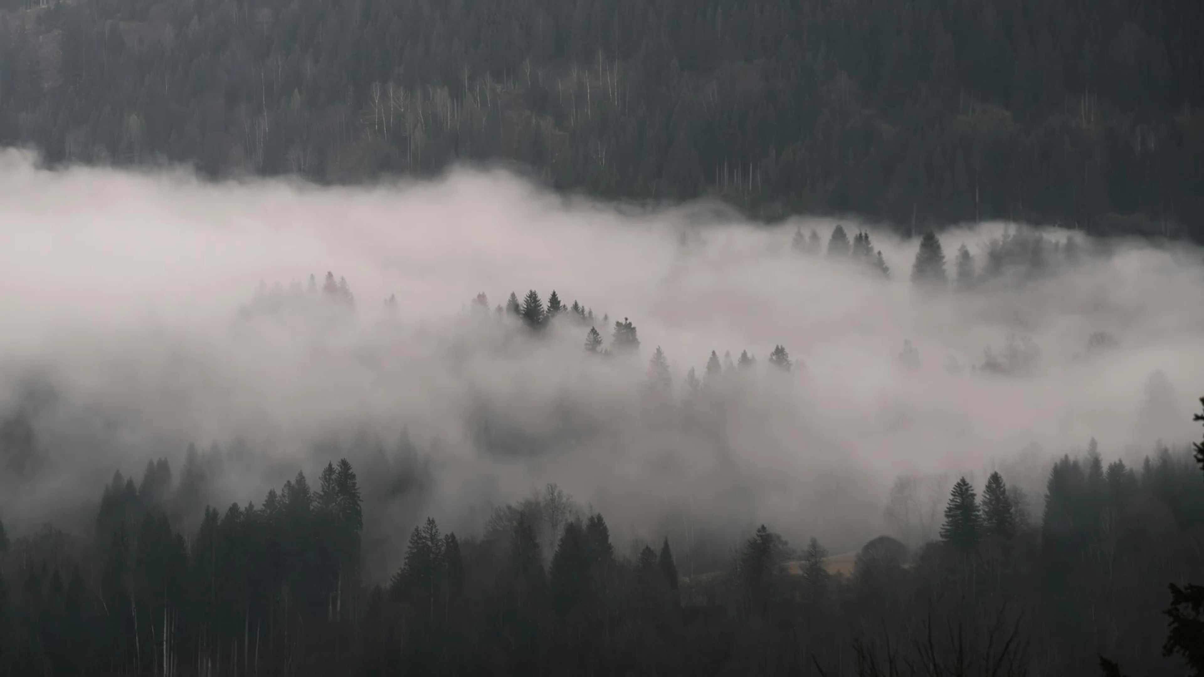 Get this stunning Serene misty forest landscape with fog covering pine trees, creating a moody atm wallpaper in 4K Ultra HD quality. 3840x2160 fantasy wallpaper available for free download.