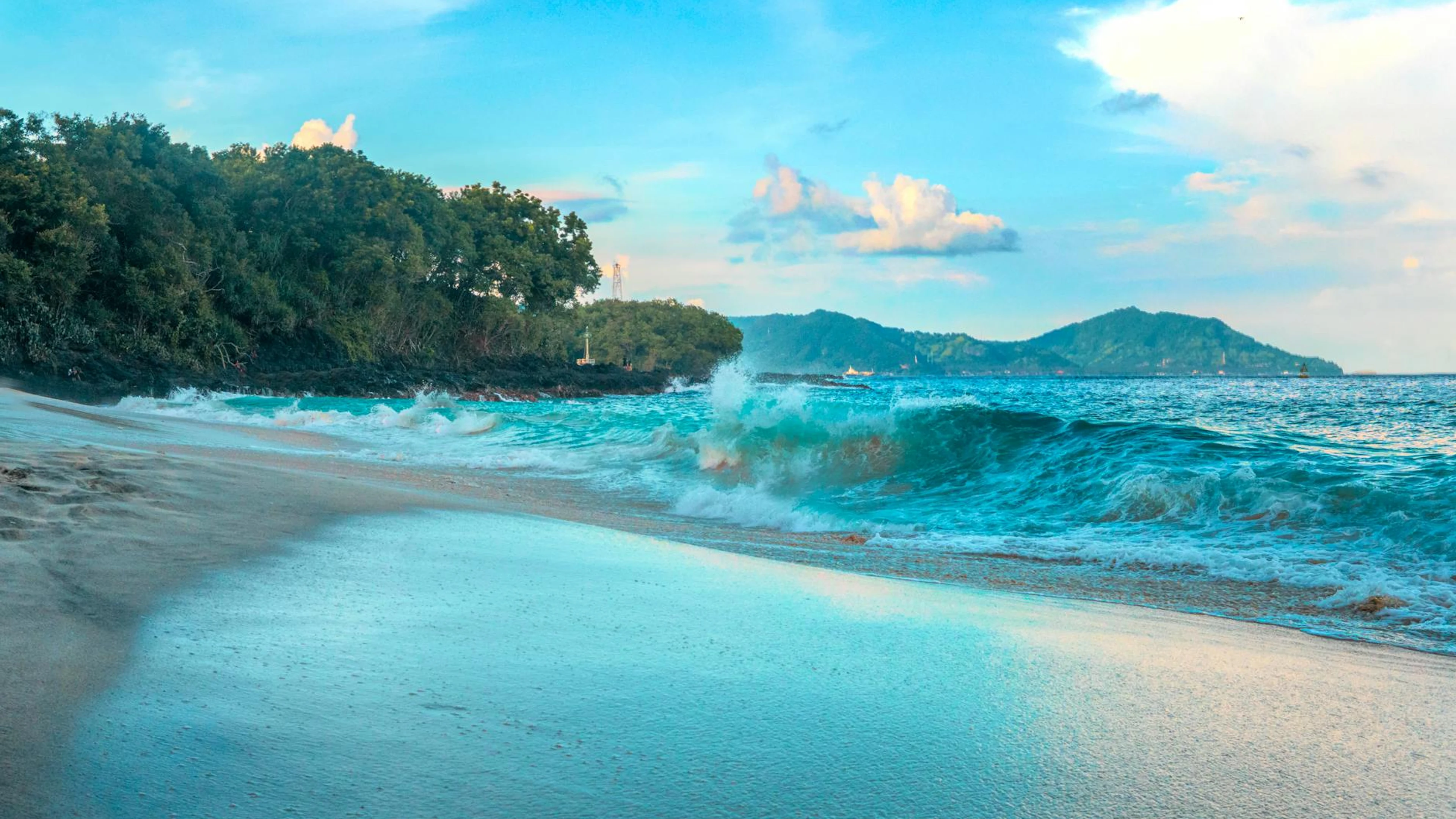 Get this stunning Serene sandy beach with vibrant turquoise waters and lush greenery in Bali, Indo wallpaper in 4K Ultra HD quality. 3840x2160 ocean wallpaper available for free download.