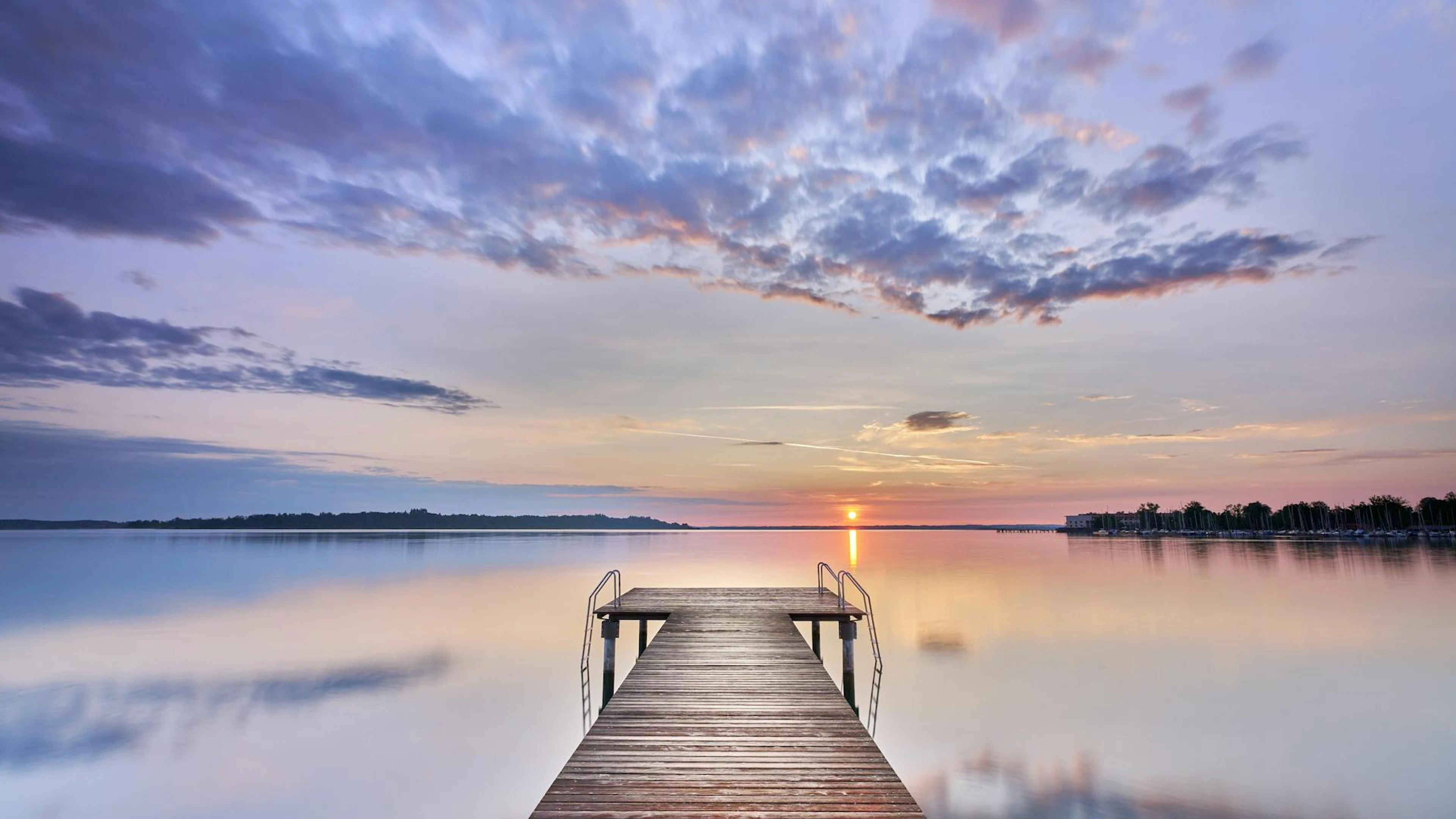 Download Serene sunset over a calm lake in Bayern, Germany with a wooden pier leading to wallpaper for free. 3840x2160 4K Ultra HD resolution, perfect for your desktop. High quality lake wallpaper.