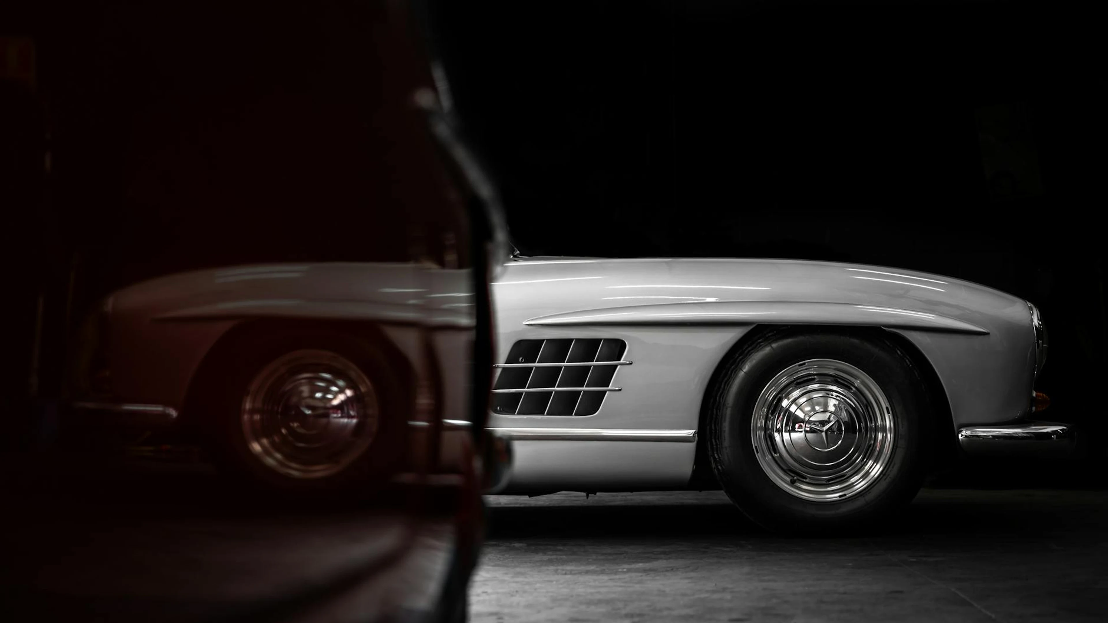 Side view of a vintage Mercedes 300 SL in a dimly lit garage, showcasing classic