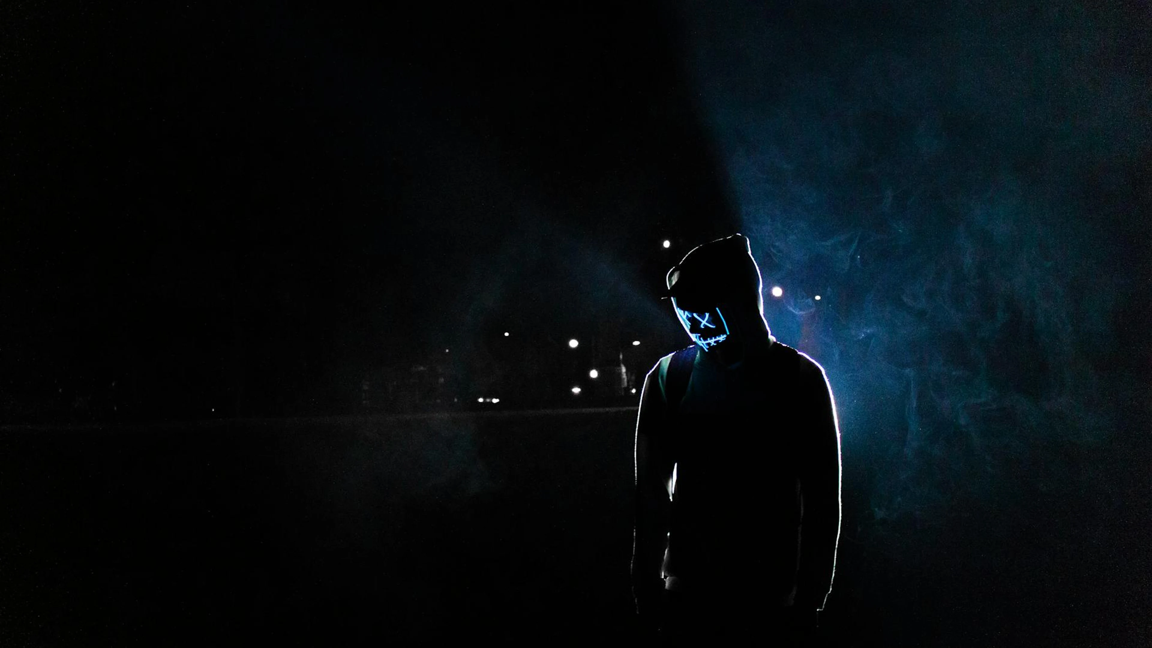 Download Silhouette of a man in a glowing LED mask and hoodie in a dark, foggy setting. wallpaper for free. 3840x2160 4K Ultra HD resolution, perfect for your desktop. High quality dark wallpaper.