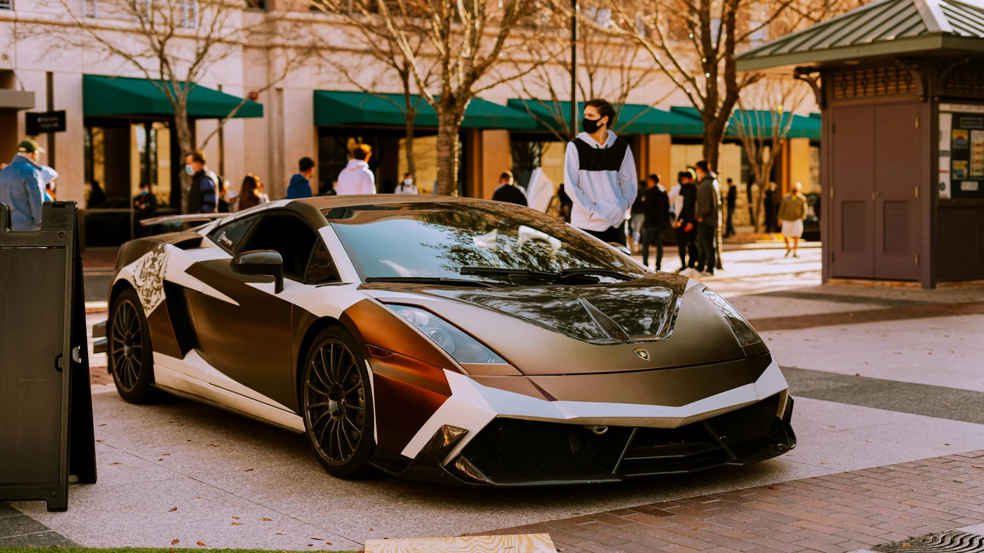 Get this stunning Sleek Lamborghini Gallardo parked outdoors with people in background, urban sett wallpaper in 4K Ultra HD quality. 3840x2160 cars wallpaper available for free download.