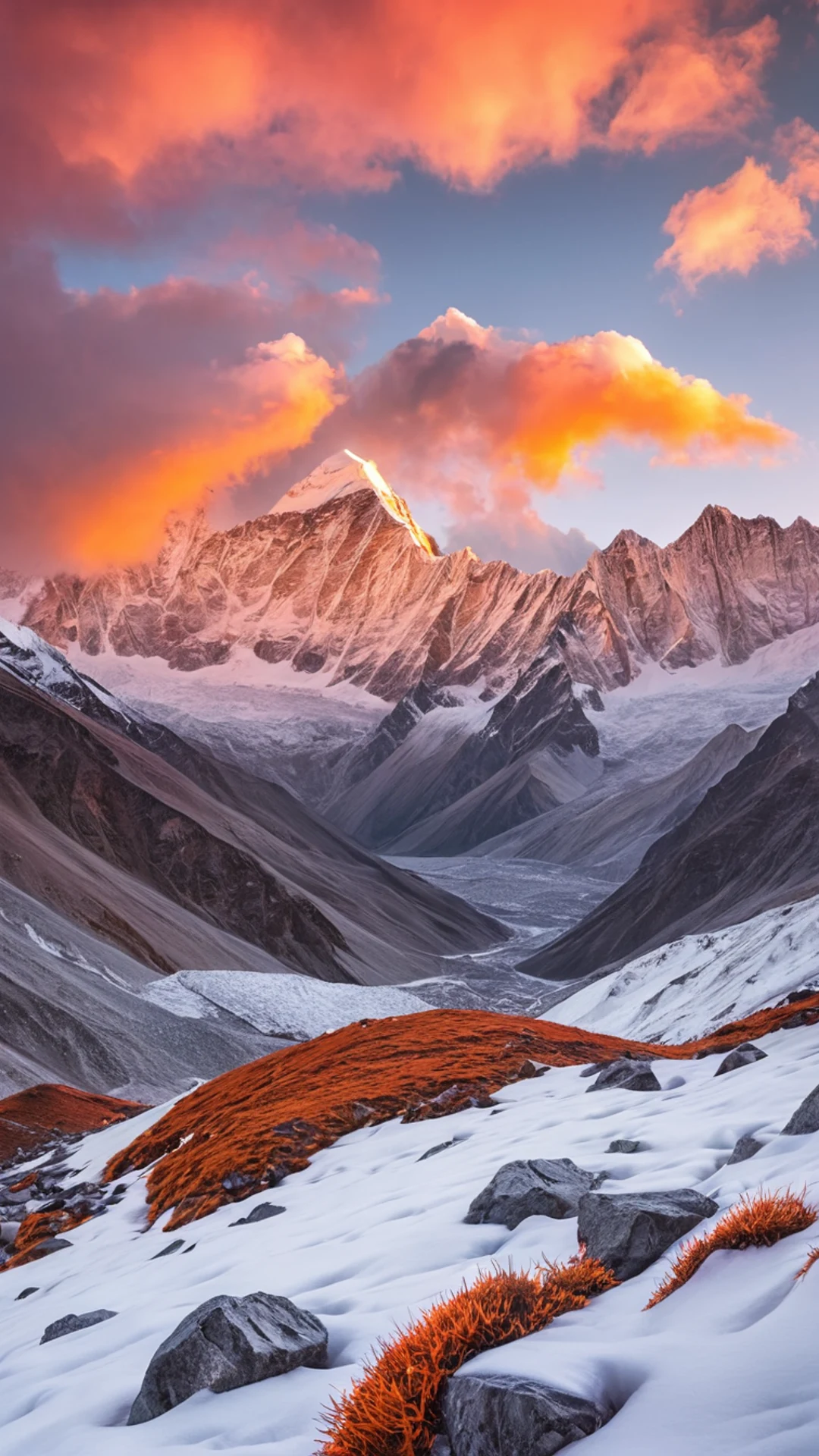 Download Snow Capped Peaks Sunrise wallpaper for free. 1080x1920 phone resolution, perfect for your phone. High quality mountain wallpaper.