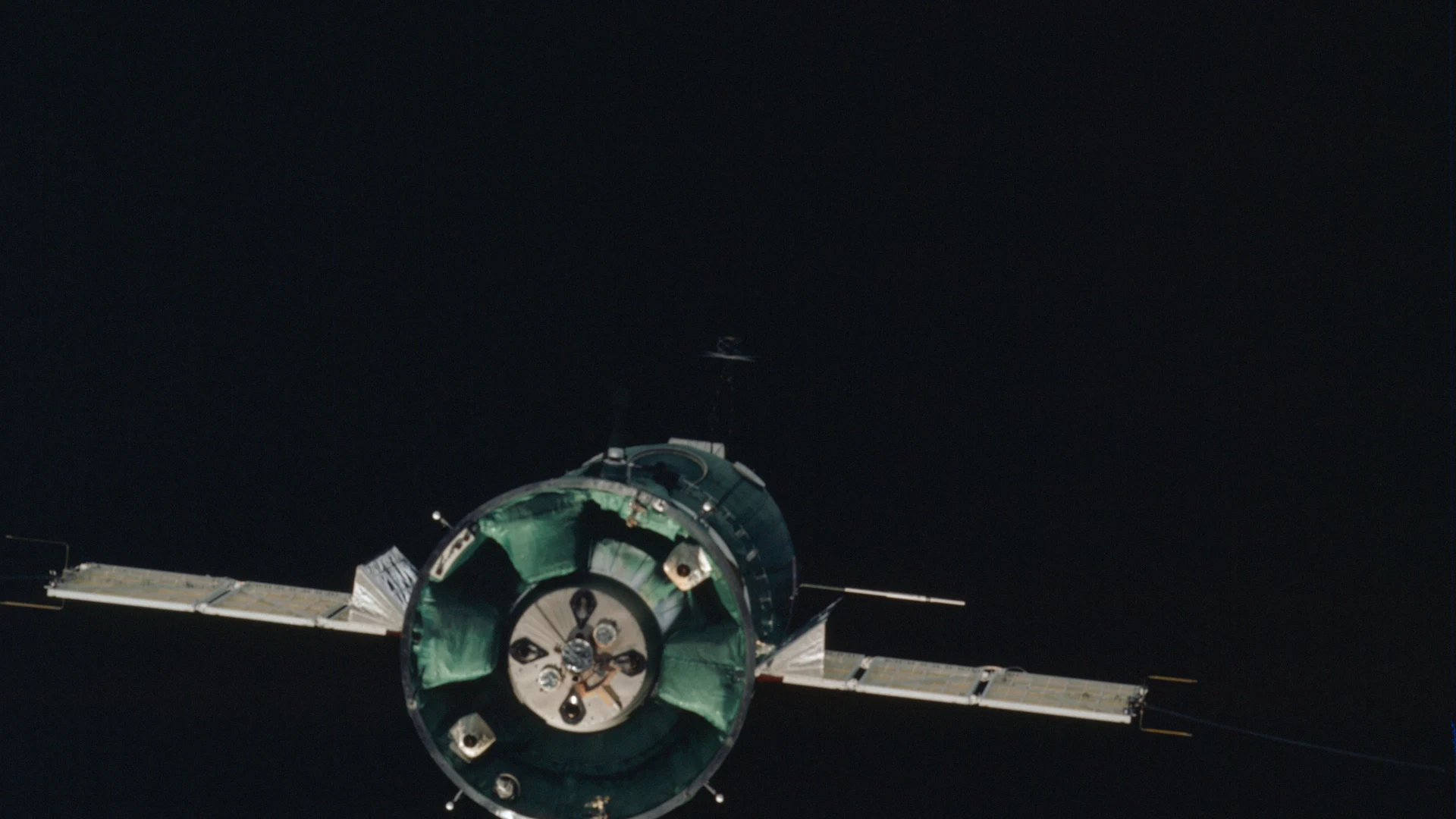 Soviet Soyuz spacecraft in orbit as seen from American Apollo spacecraft