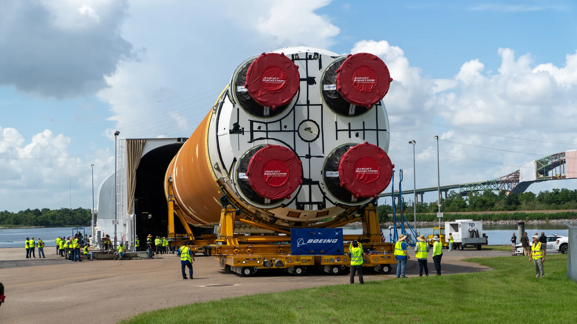 Free Space Launch System Core Stage for Artemis II Rocket Loaded onto Pegasus Barge wallpaper in tablet resolution (1920x1080). Beautiful space background for your screen. No signup required.