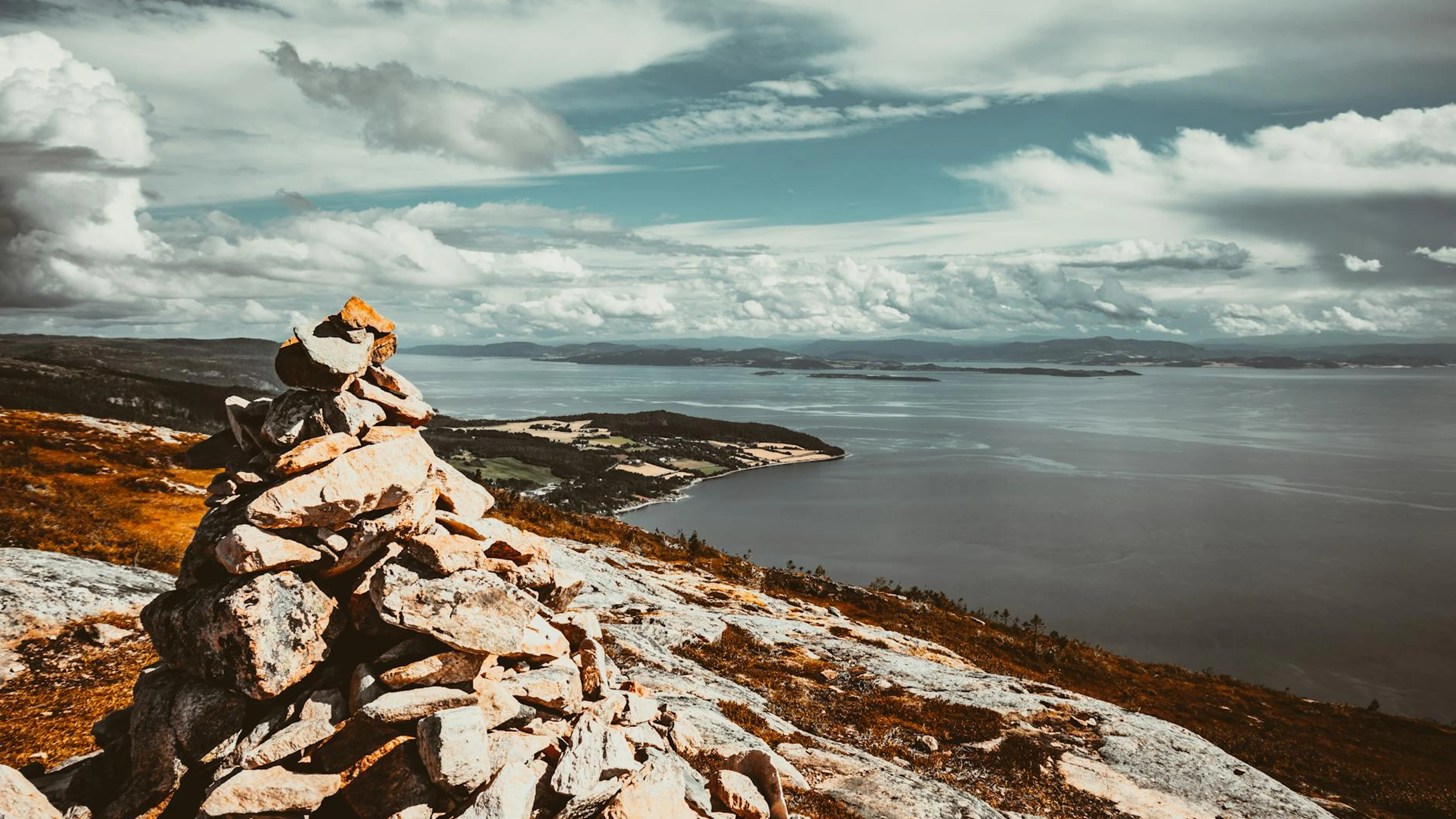 Get this stunning Stone cairn on a hill with panoramic coastal view, under dramatic sky. wallpaper in 4K Ultra HD quality. 3840x2160 nature wallpaper available for free download.