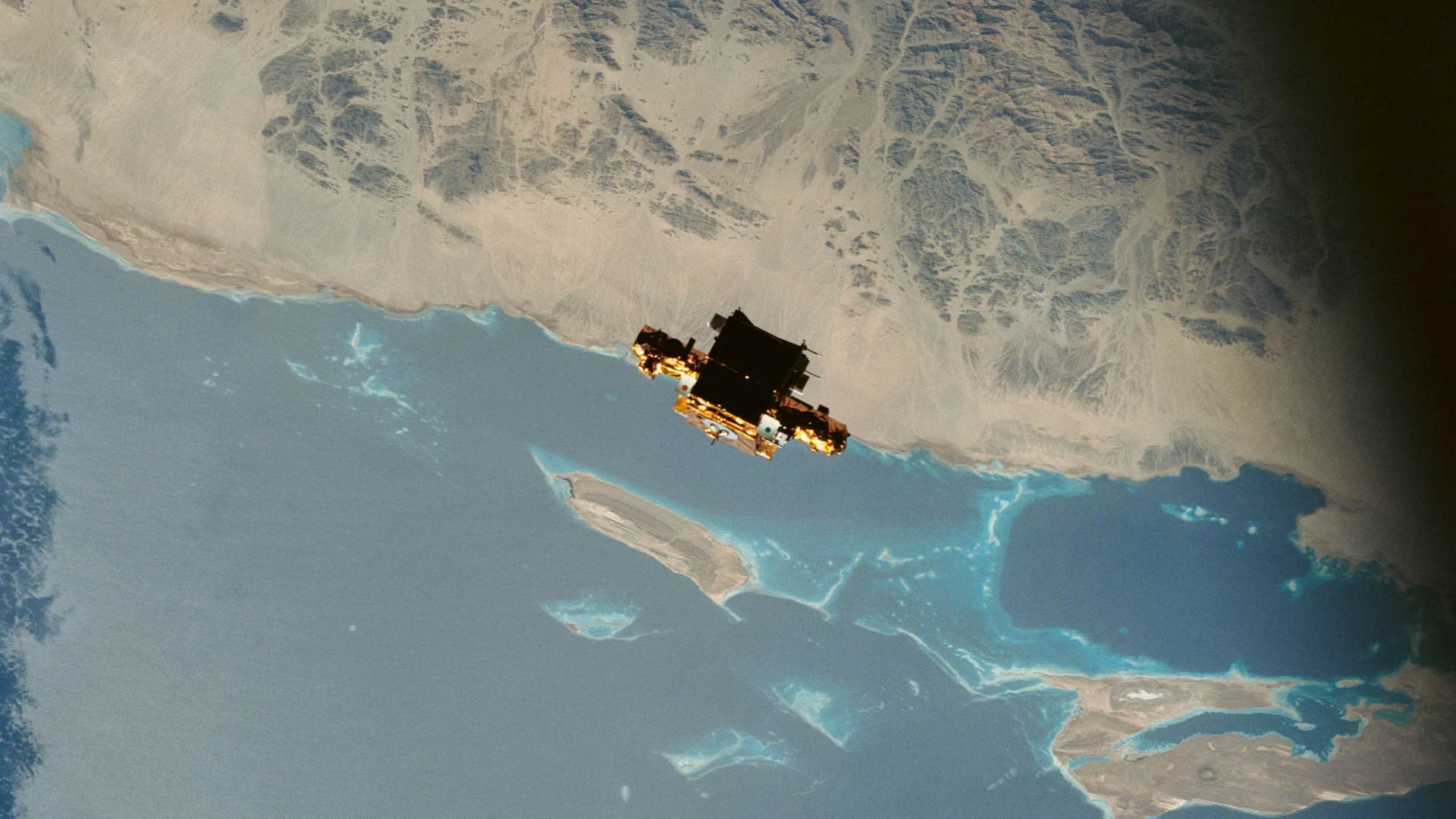 STS-56 freeflying SPARTAN-201 backdropped over the Red Sea coast of Sudan