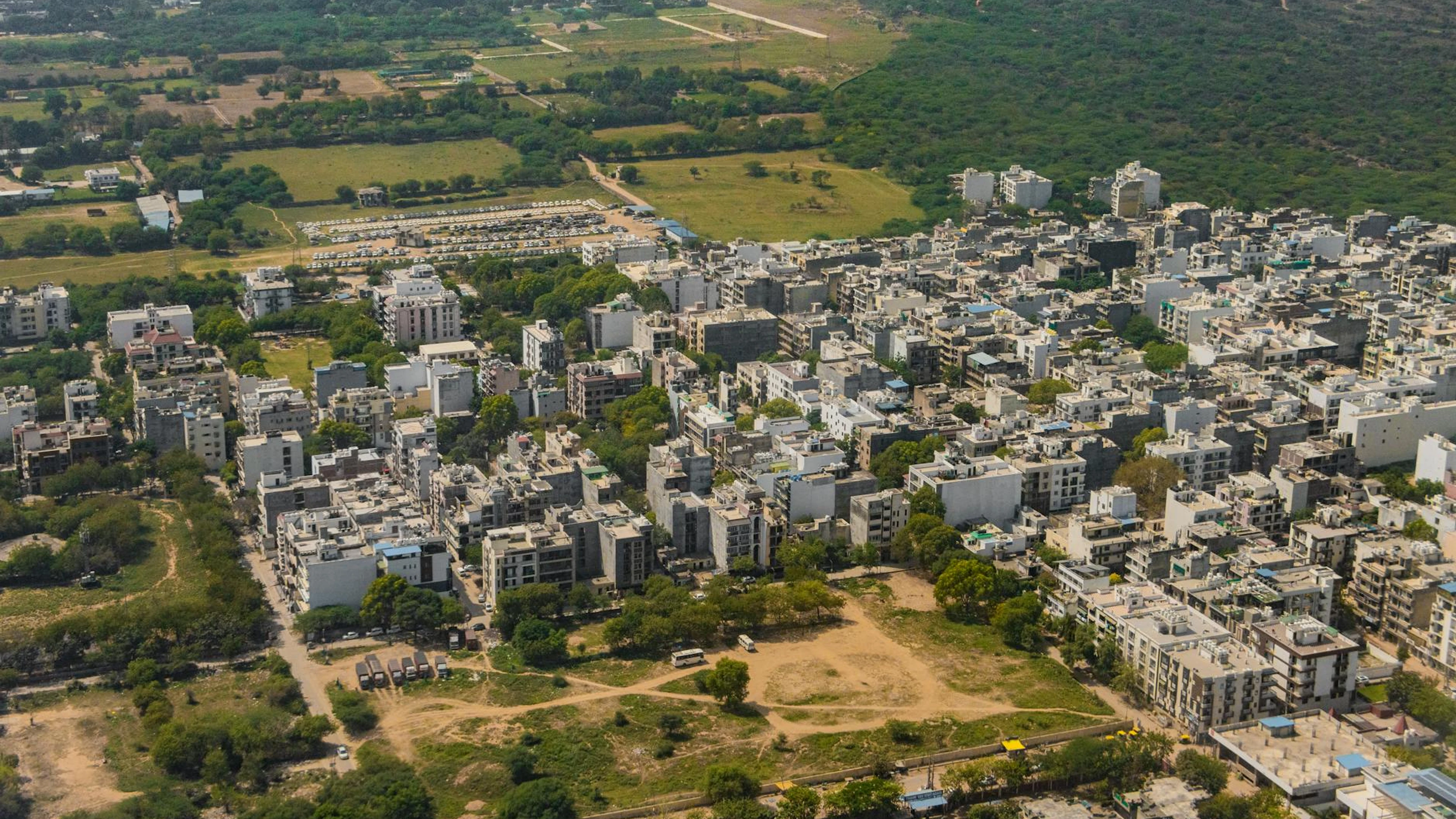 Stunning aerial view of Gurugram, India's vibrant urban landscape and green surr