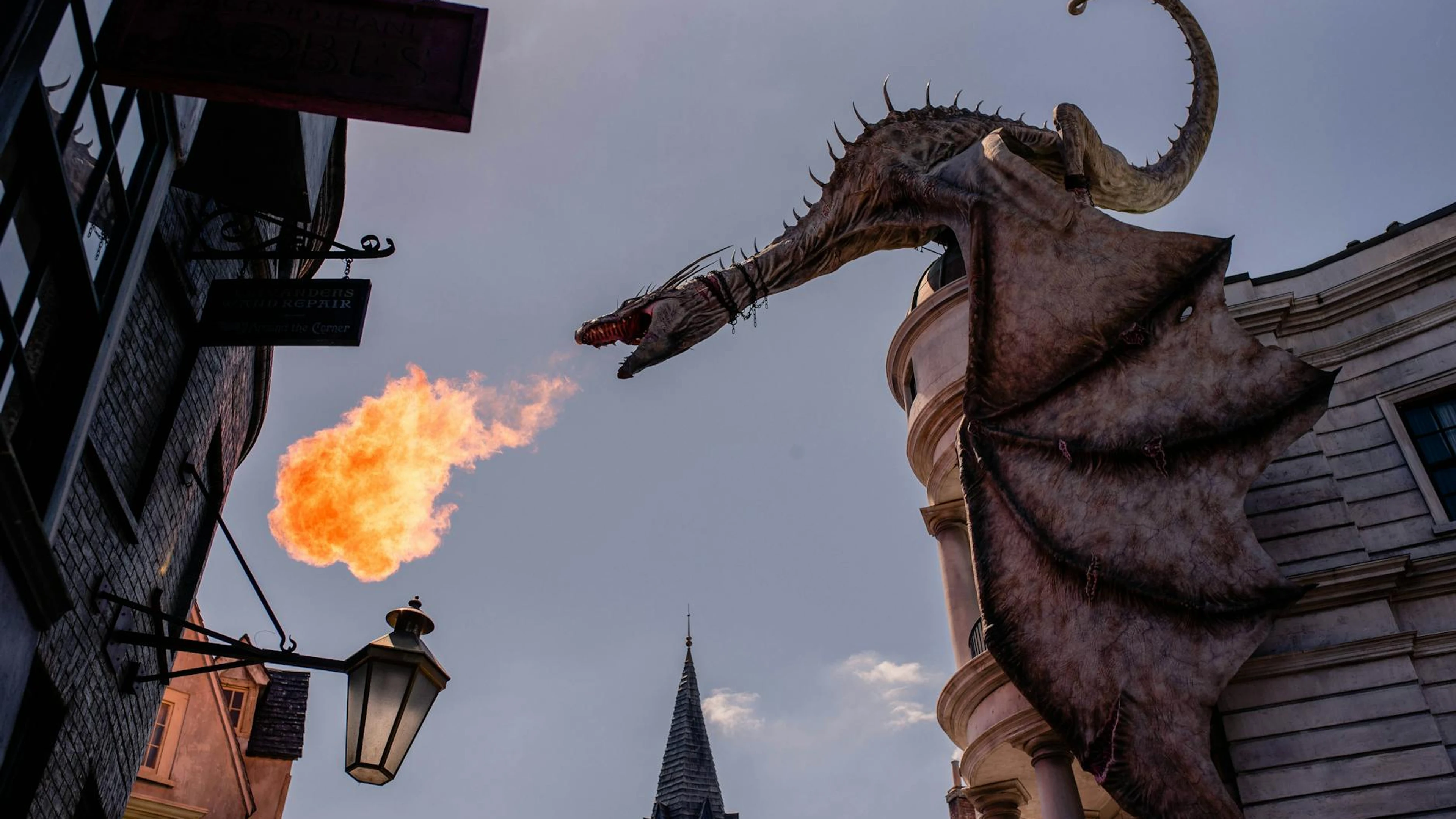 Get this stunning Stunning dragon sculpture breathing fire at a themed street in Orlando, Florida. wallpaper in 4K Ultra HD quality. 3840x2160 fantasy wallpaper available for free download.