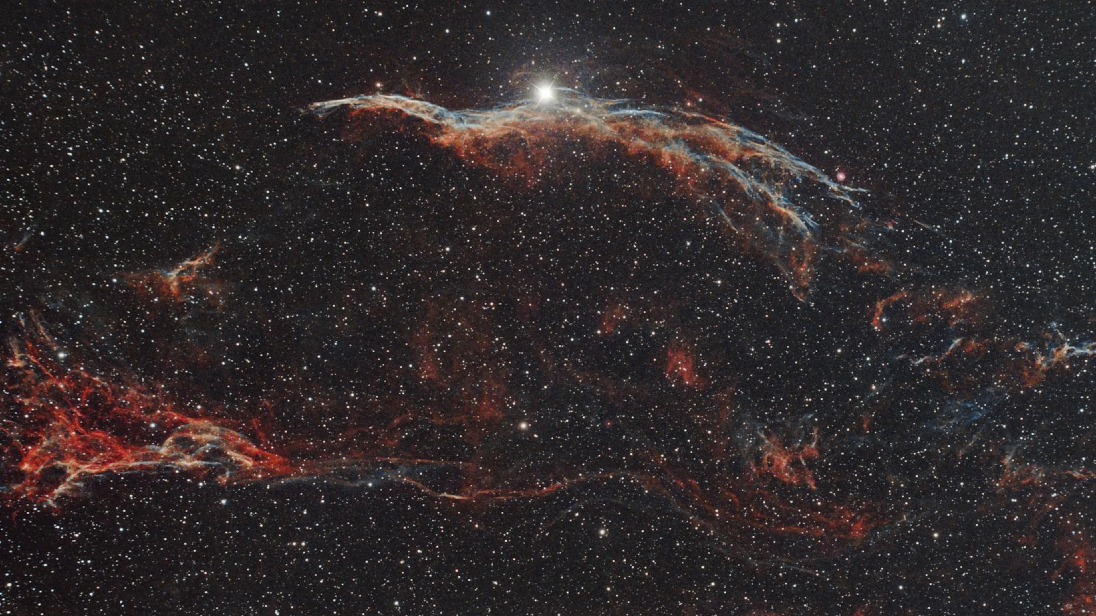 Free Stunning image of the Veil Nebula in deep space with vivid star field. wallpaper in 4K Ultra HD resolution (3840x2160). Beautiful space background for your screen. No signup required.