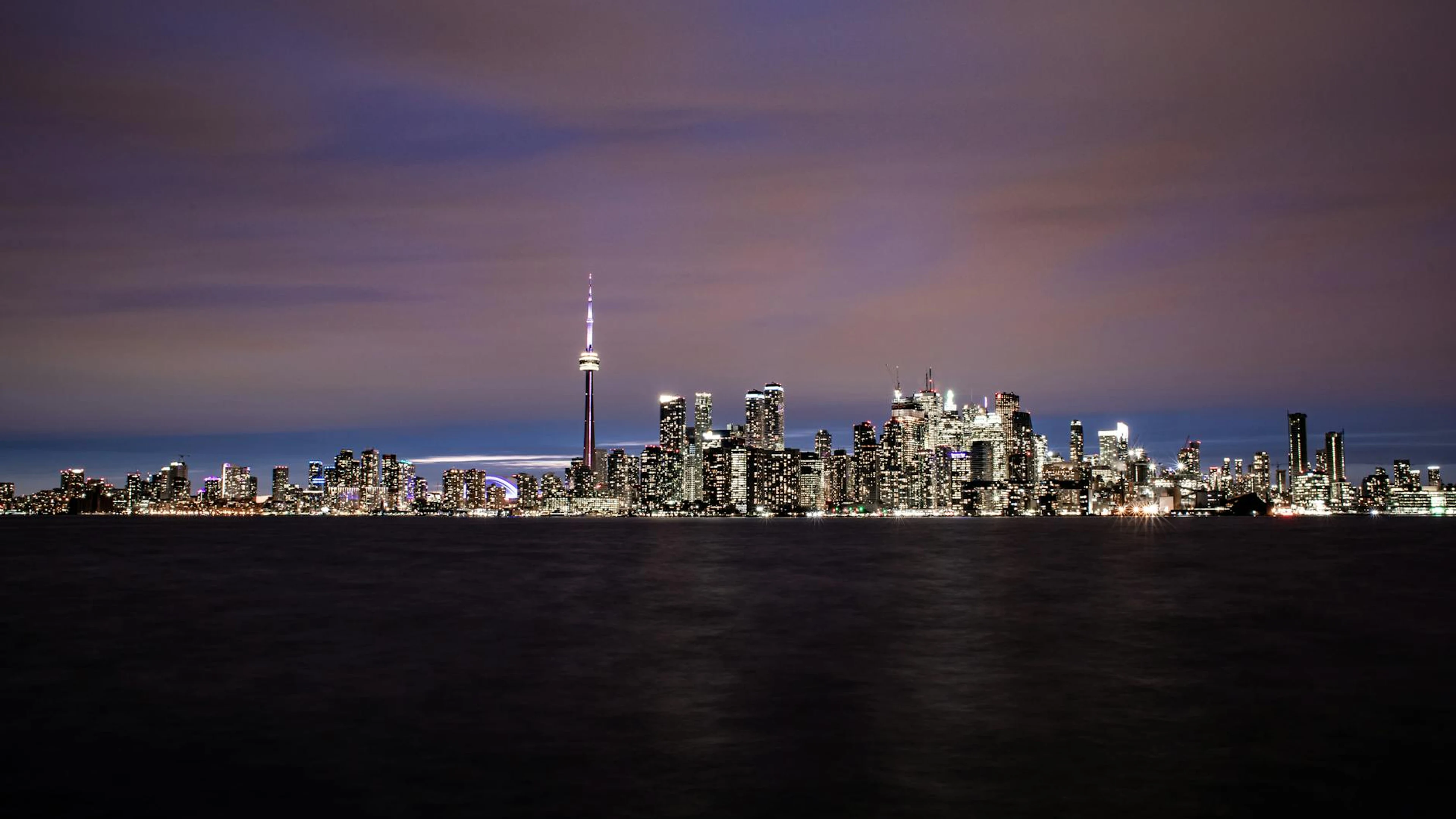 Stunning night view of Toronto skyline featuring the iconic CN Tower illuminated - free 4K Ultra HD city wallpaper for desktop