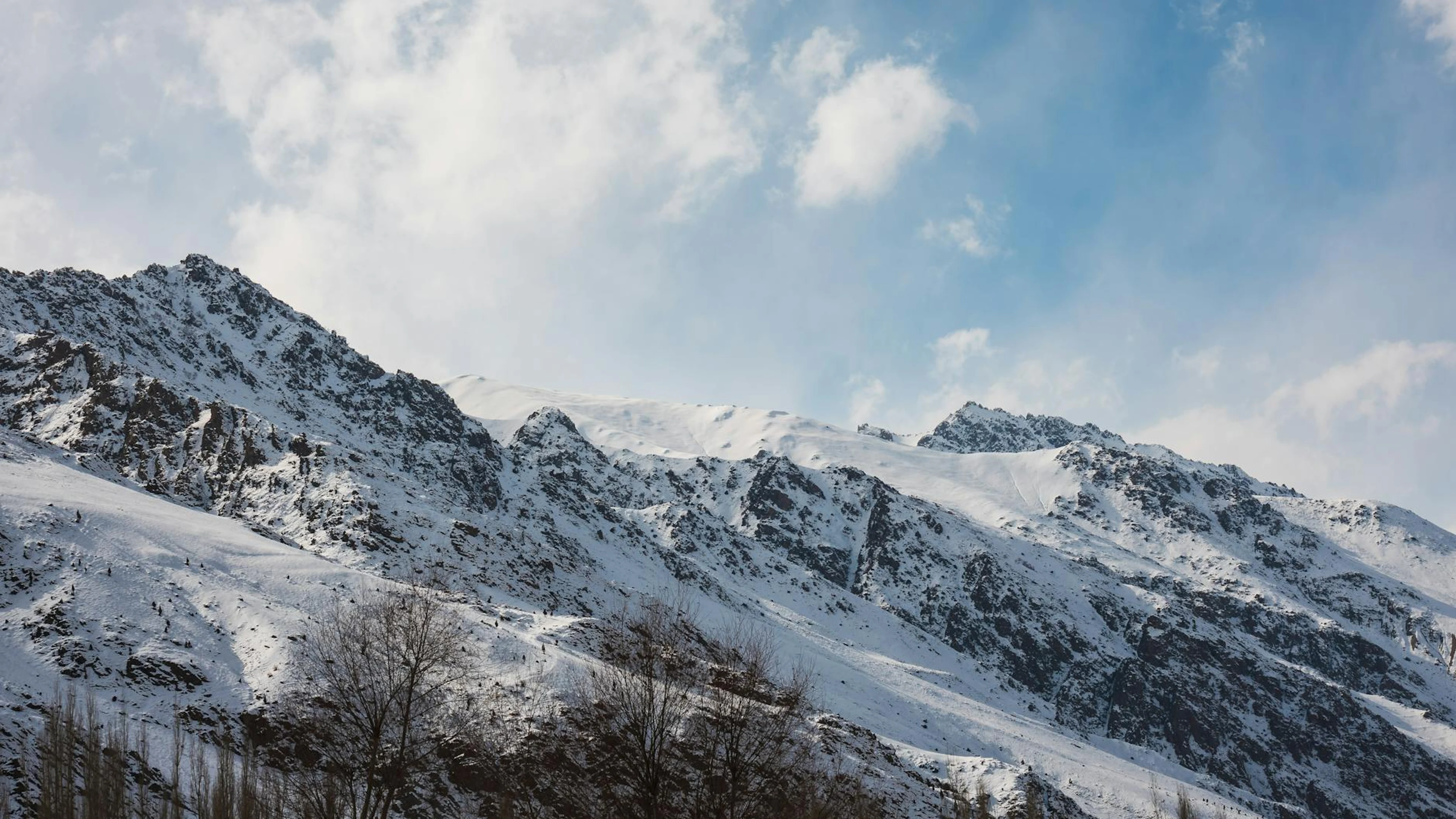 Get this stunning Stunning snow-covered mountains under a bright blue sky with white fluffy clouds wallpaper in 4K Ultra HD quality. 3840x2160 mountain wallpaper available for free download.