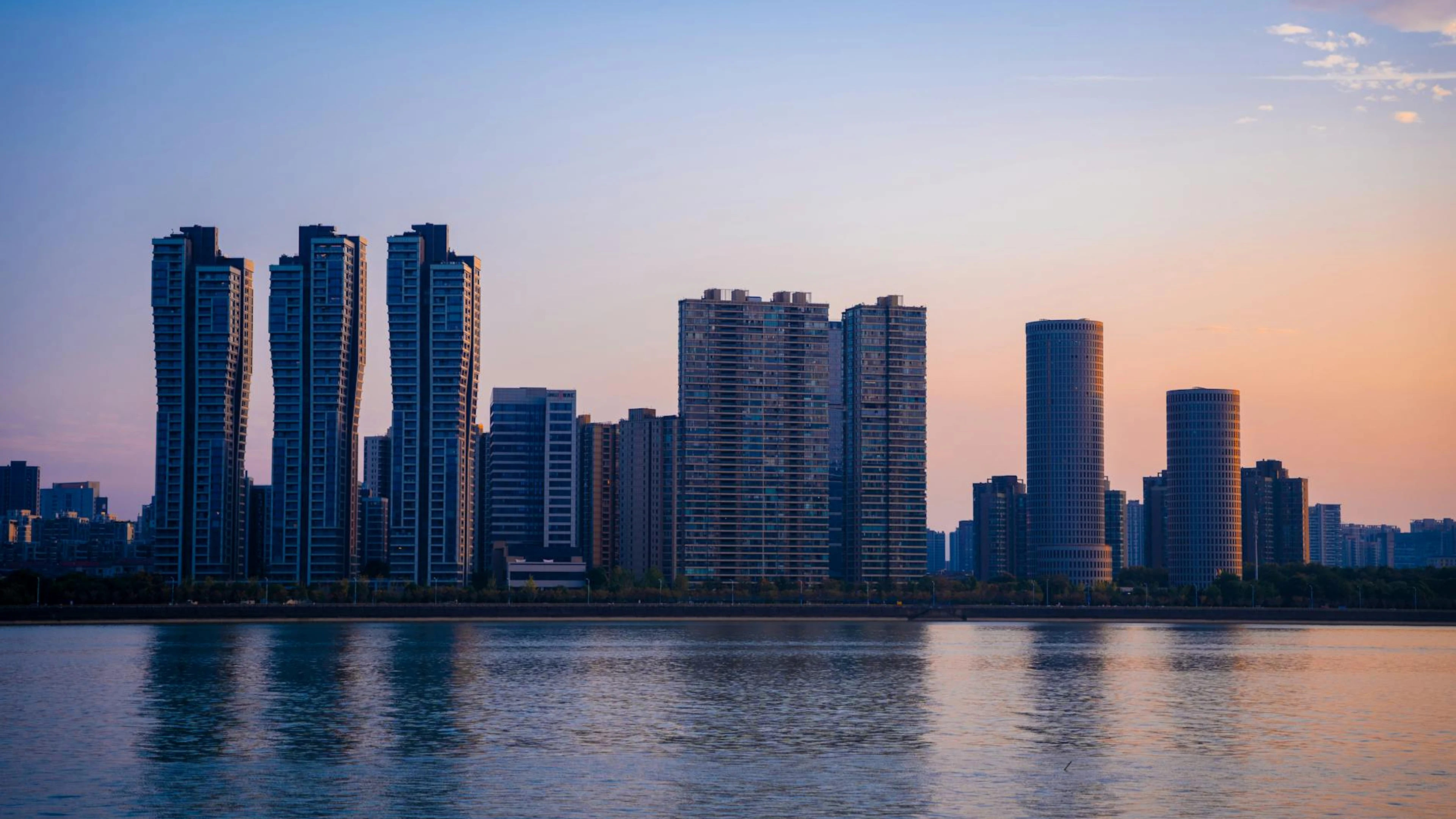 Get this stunning Stunning view of Hangzhou's skyline at sunset, showcasing modern skyscrapers and wallpaper in 4K Ultra HD quality. 3840x2160 architecture wallpaper available for free download.