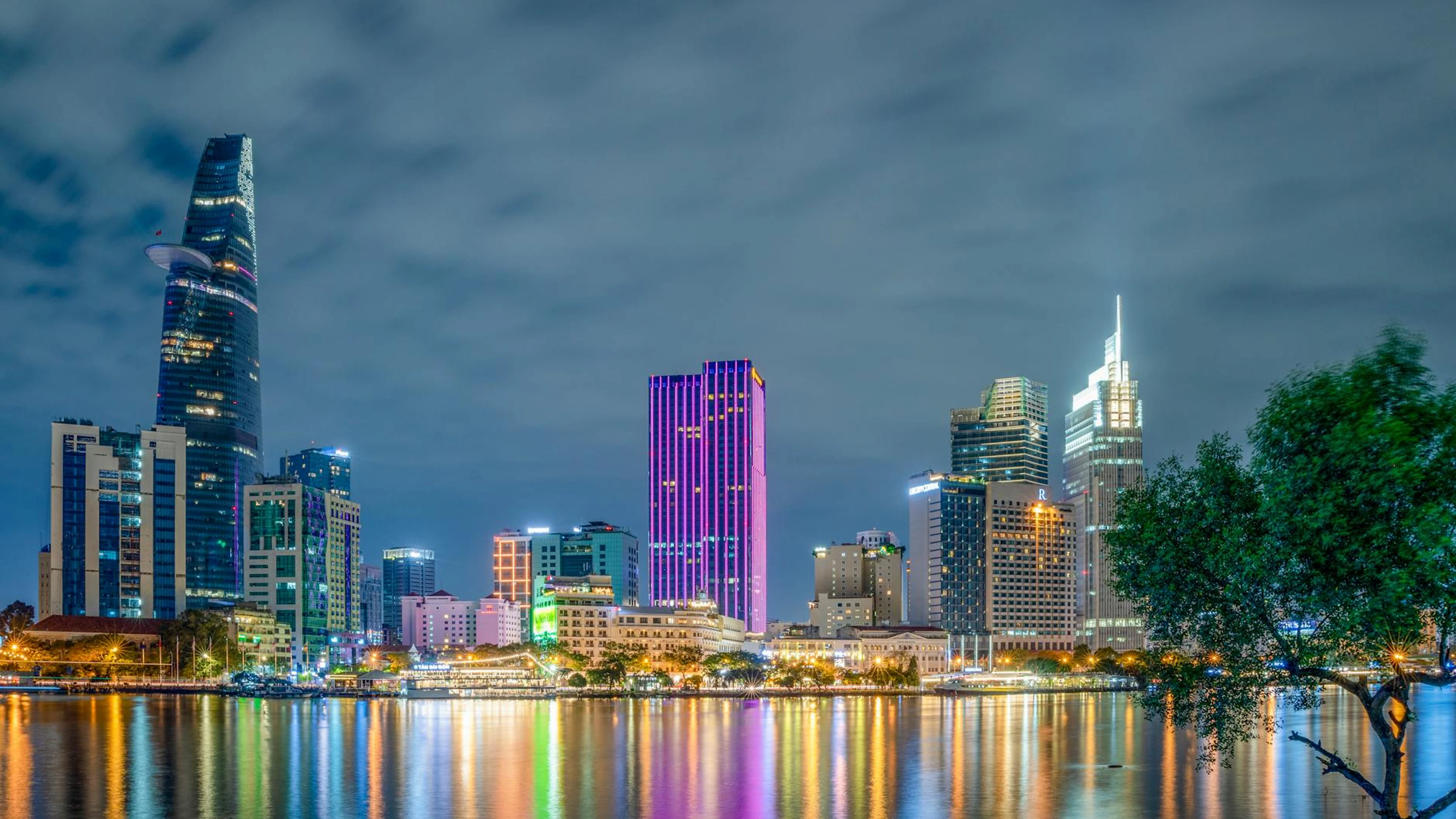 Get this stunning Stunning view of Ho Chi Minh City's illuminated skyline at night with reflection wallpaper in 4K Ultra HD quality. 3840x2160 city wallpaper available for free download.