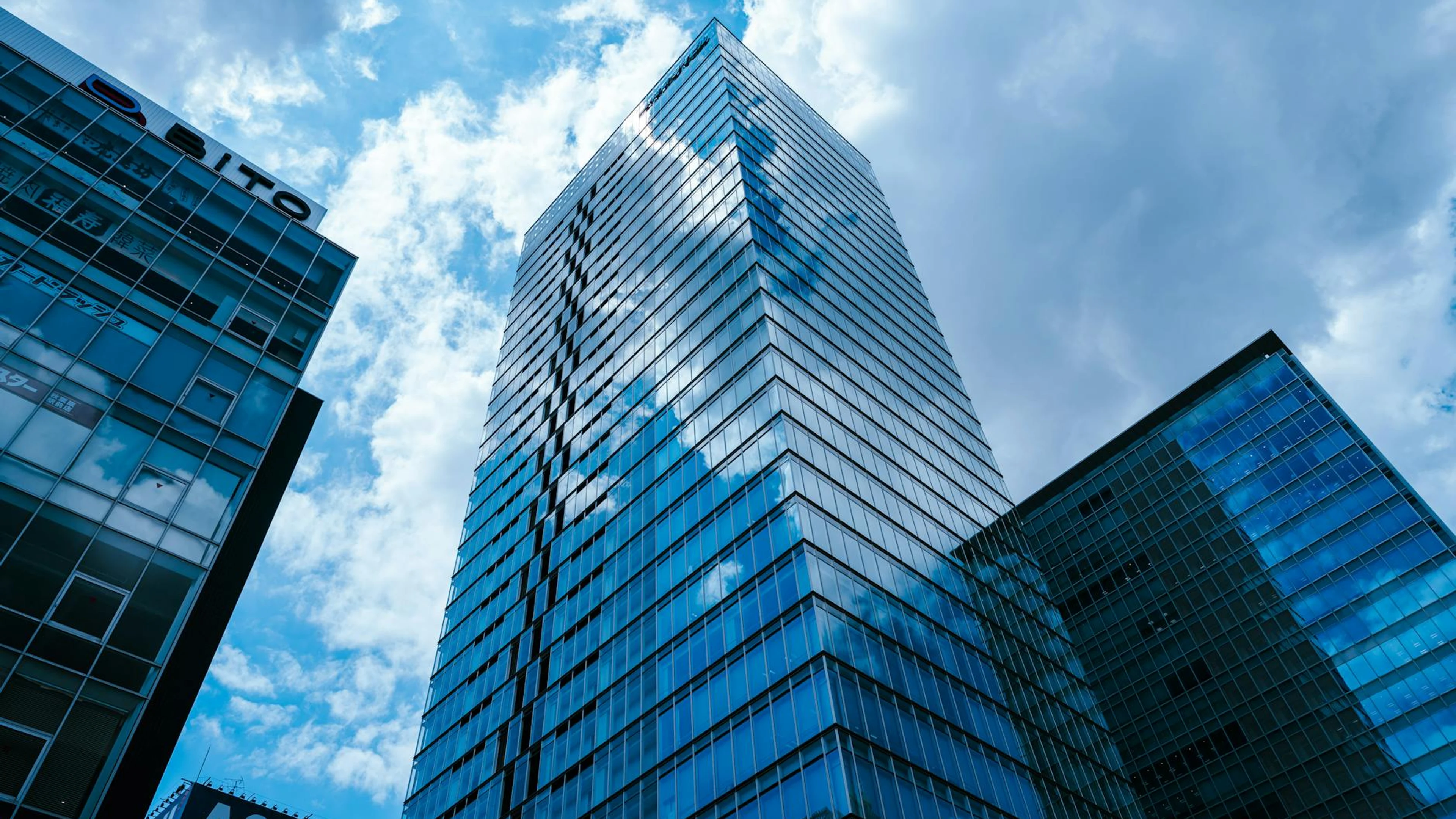Stunning view of modern skyscrapers in Tokyo's Taito area, reflecting clouds.