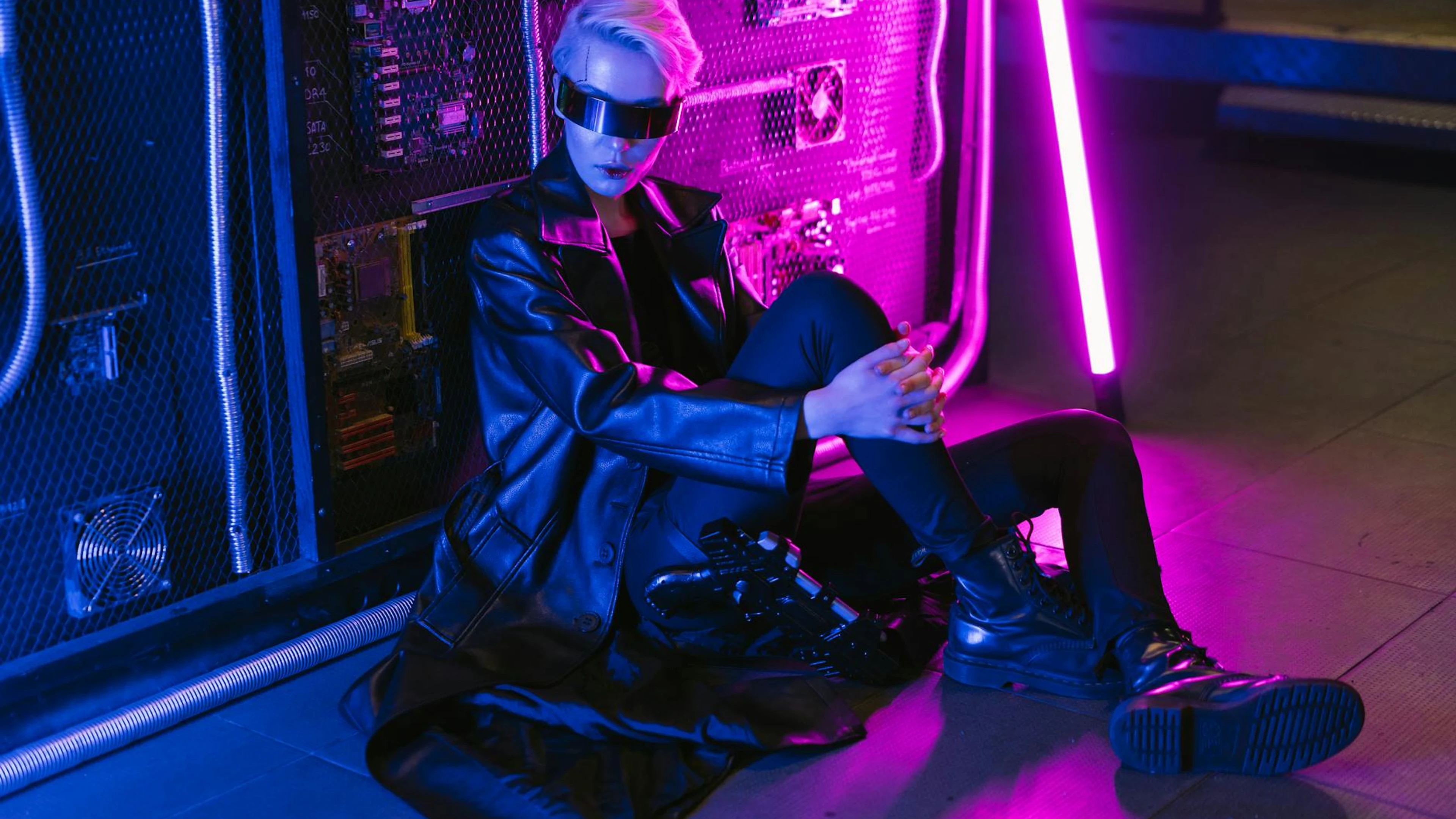 Get this stunning Stylish person in cyberpunk fashion with neon lights, capturing a futuristic vib wallpaper in 4K Ultra HD quality. 3840x2160 gaming wallpaper available for free download.
