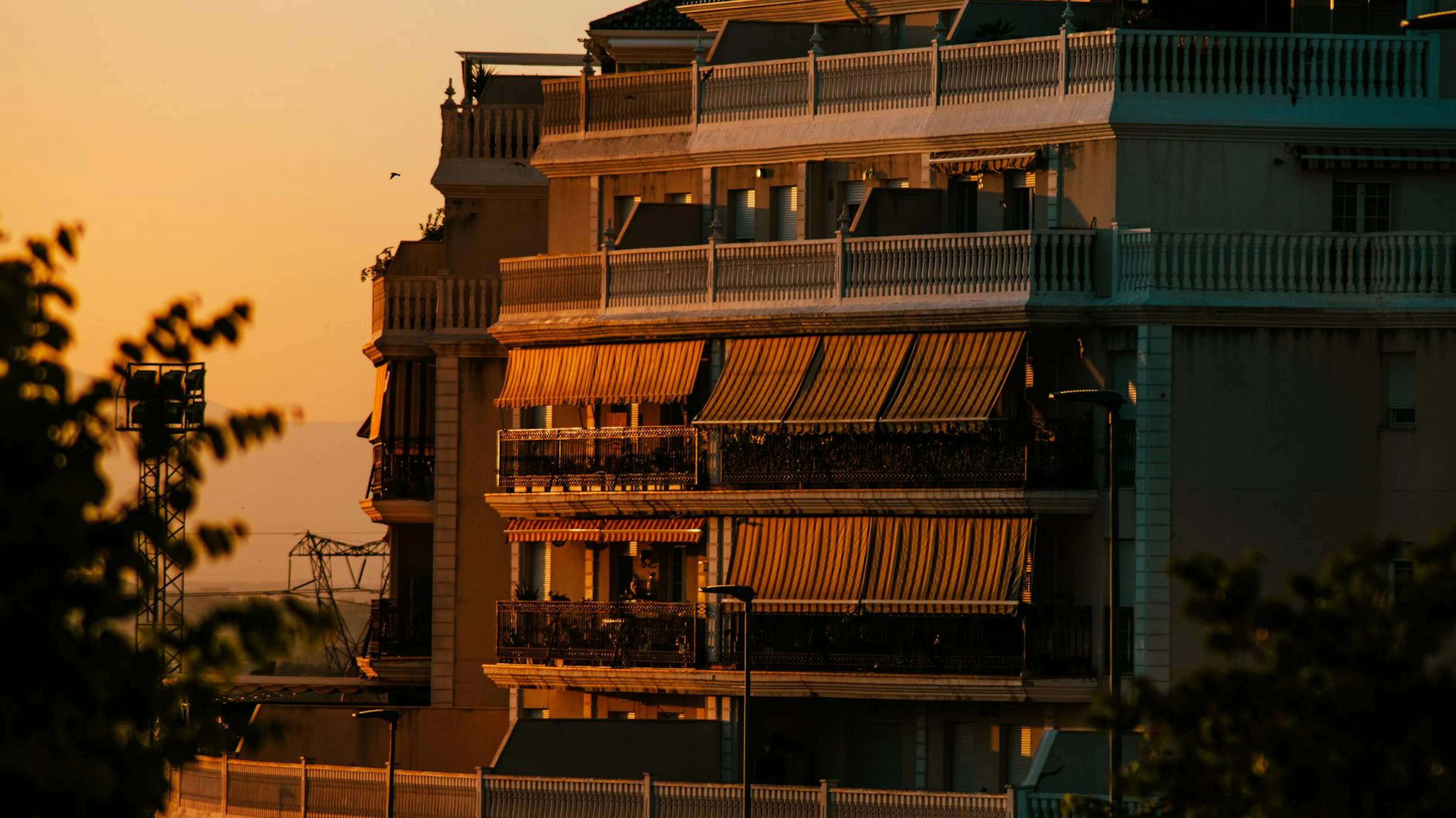 Download Sunset view of a modern urban apartment building with terraces and awnings, bath wallpaper for free. 3840x2160 4K Ultra HD resolution, perfect for your desktop. High quality sunset wallpaper.