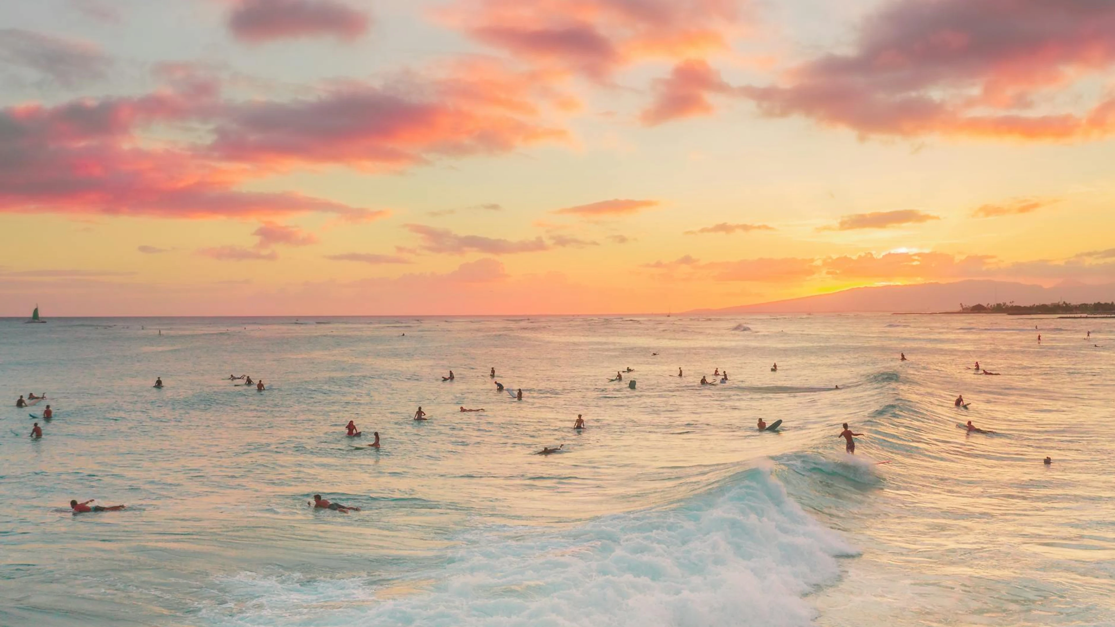 Get this stunning Surfers catch waves during a stunning sunset on Waikiki Beach, Honolulu. wallpaper in 4K Ultra HD quality. 3840x2160 sunset wallpaper available for free download.