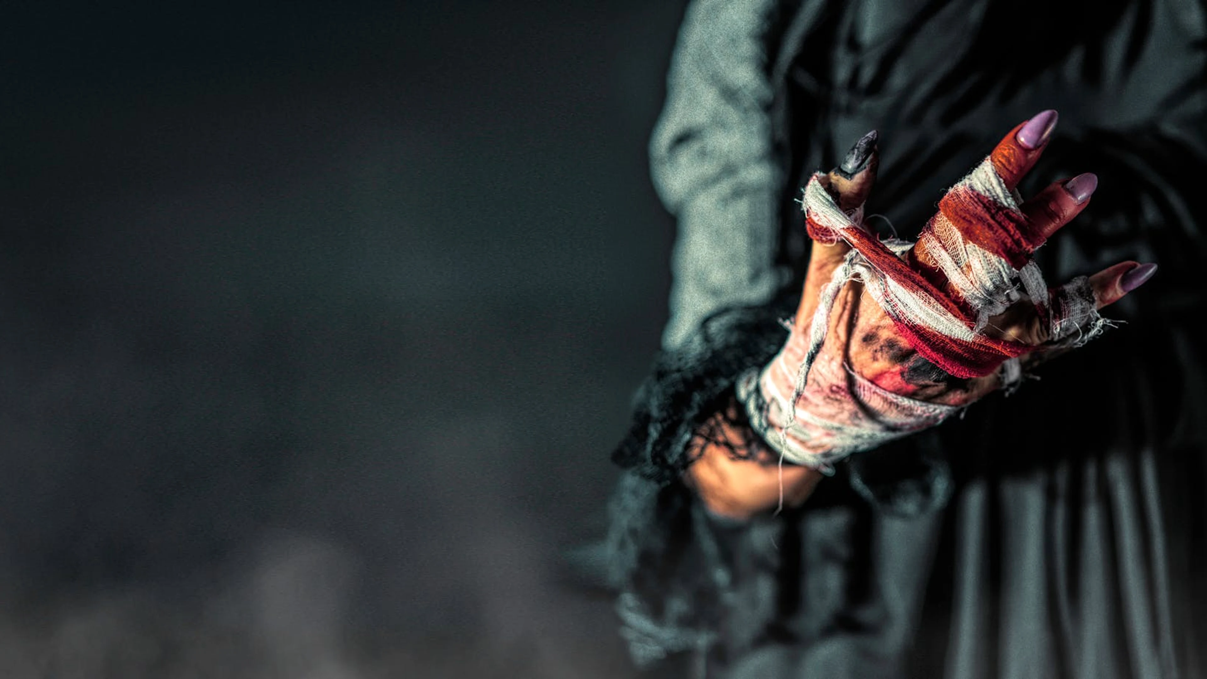 Surreal image of a woman's bloodied, bandaged hand in dark ambiance.