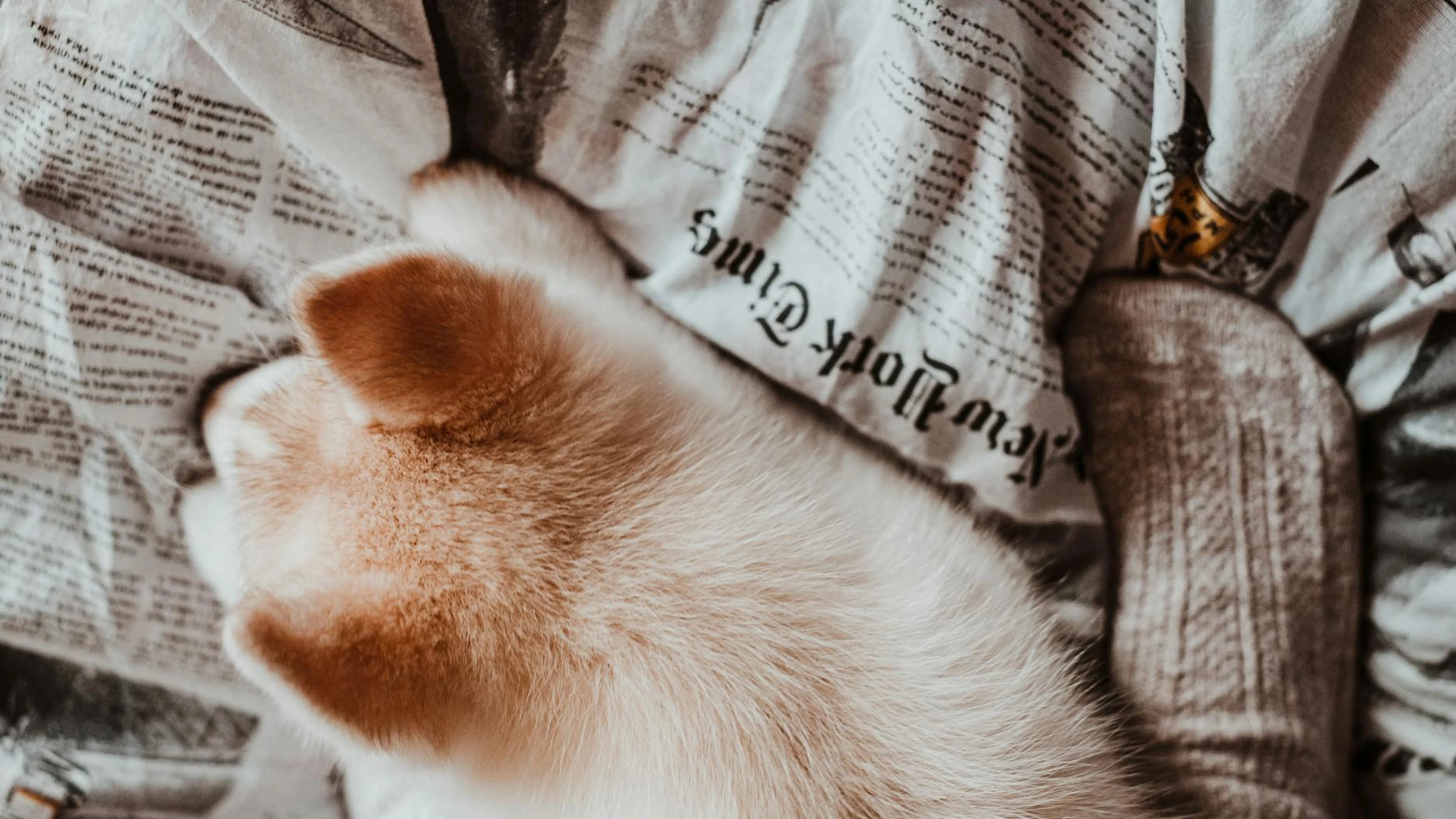 Get this stunning Sweet husky puppy sleeping comfortably on stylish newspaper print bed linens. wallpaper in 4K Ultra HD quality. 3840x2160 animals wallpaper available for free download.