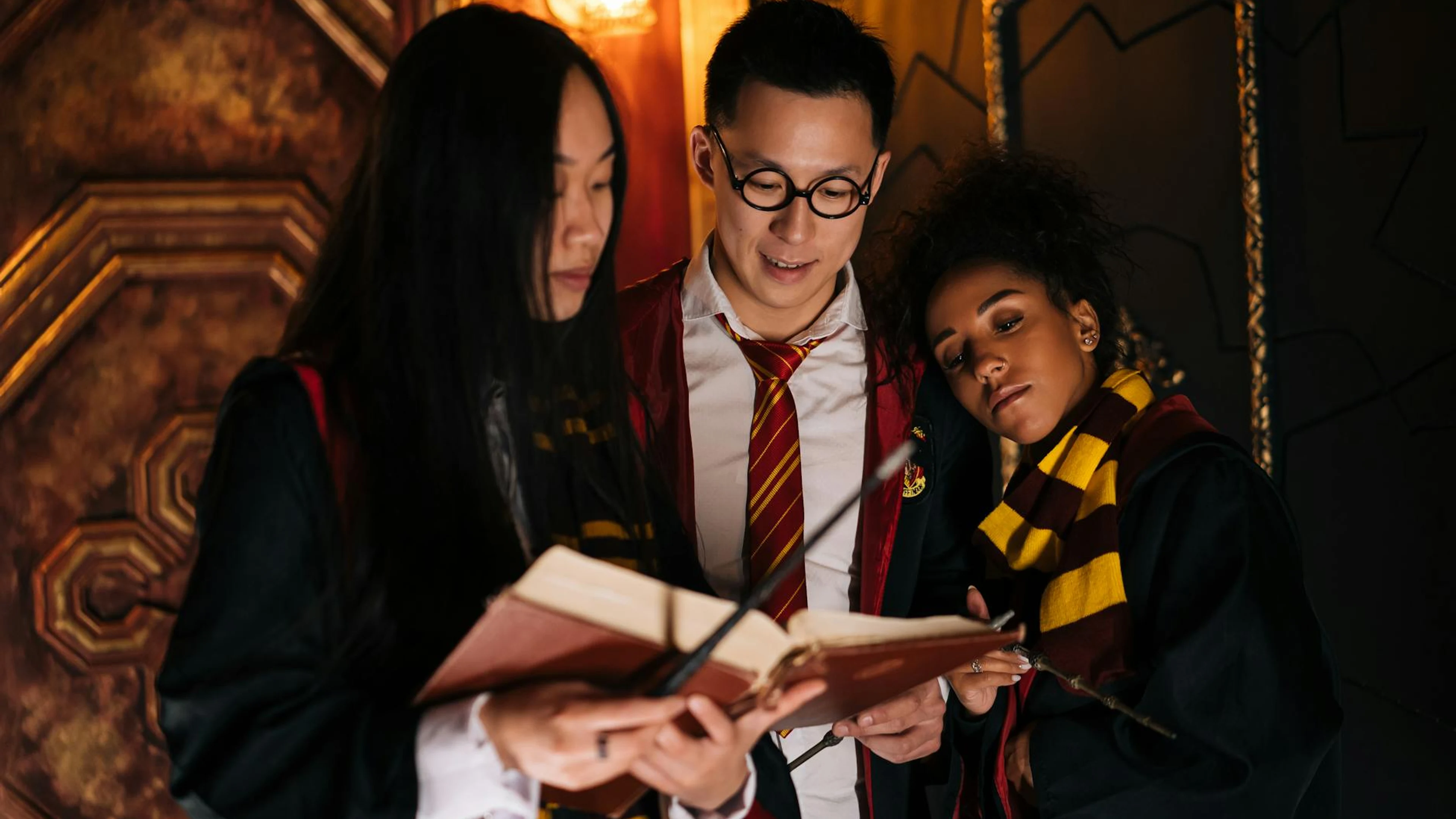 Three friends in wizard costumes reading a spellbook, exuding a magical and myst